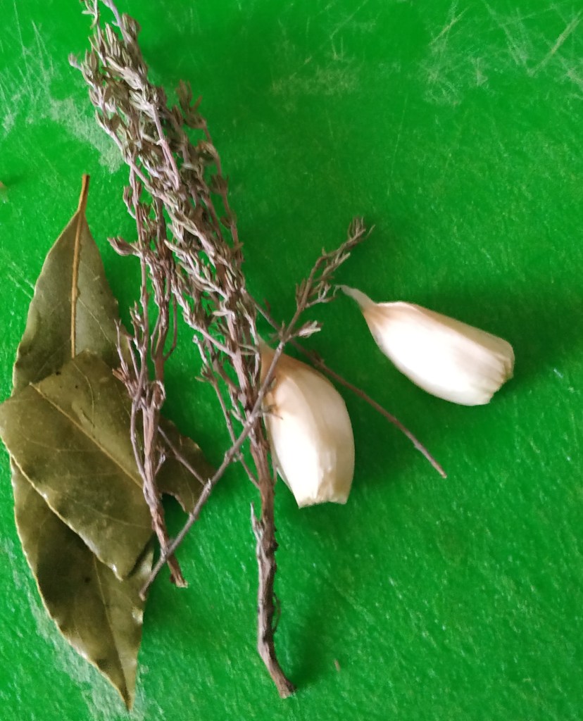 Verser l’eau dans une casserole,puis ajouter les ingrédients thym laurier, ail en chemise écrasé;