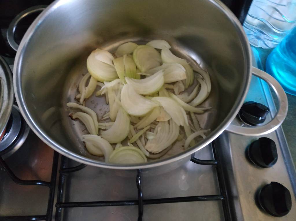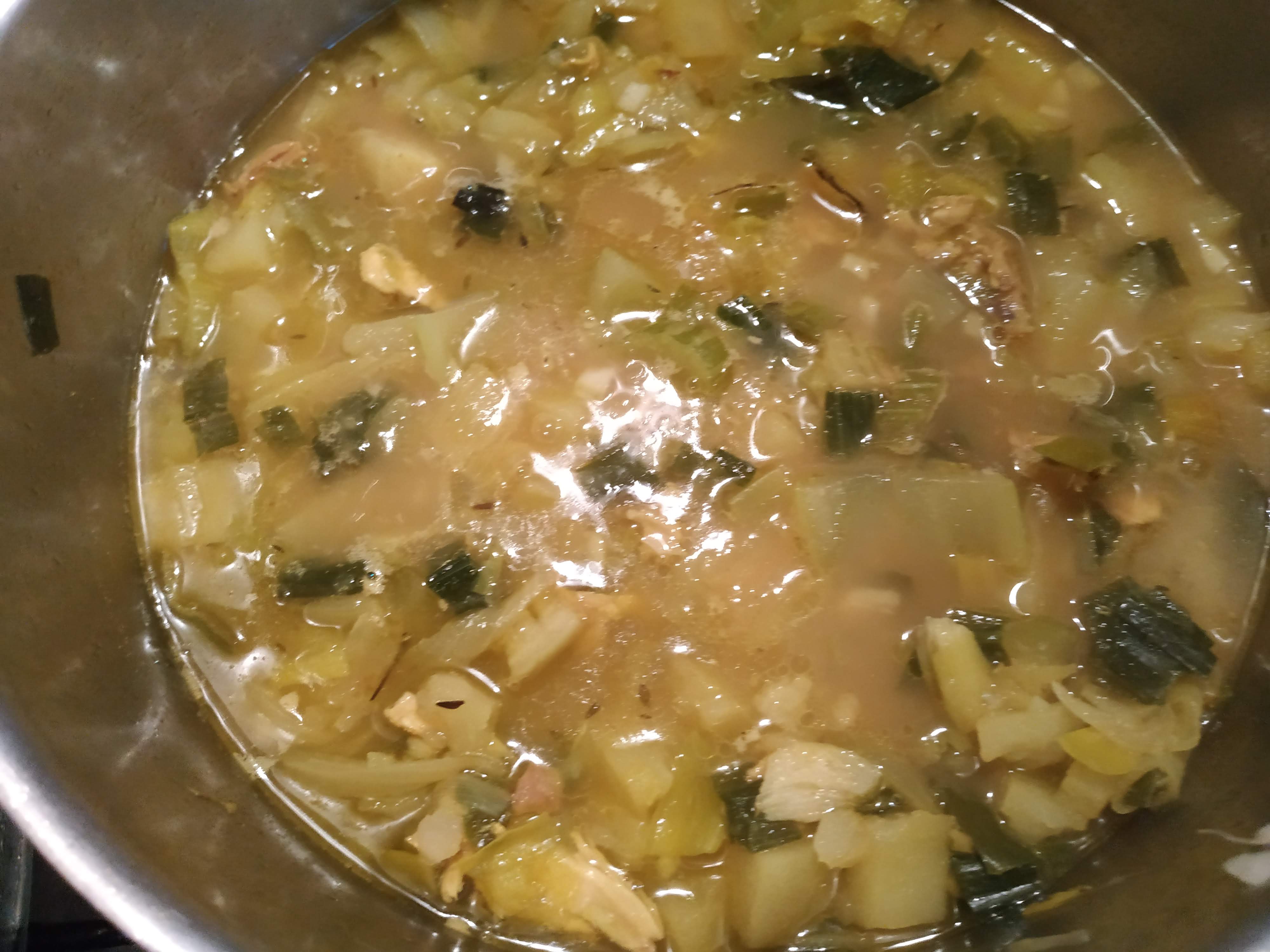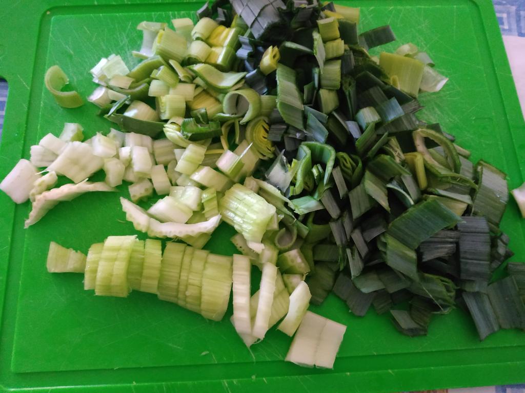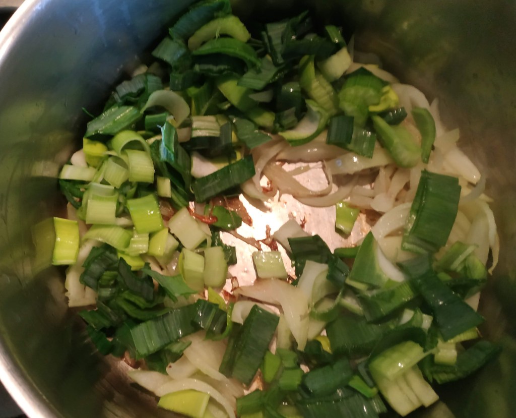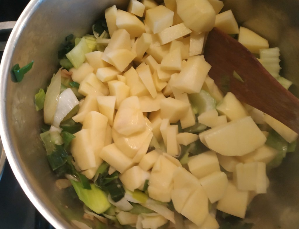 3/ Dans un grand fait-tout, faire revenir l’ognon puis ajouter tour à tour les poireaux coupés en morceaux, et faire revenir, puis les pommes de terre en petits cubes.