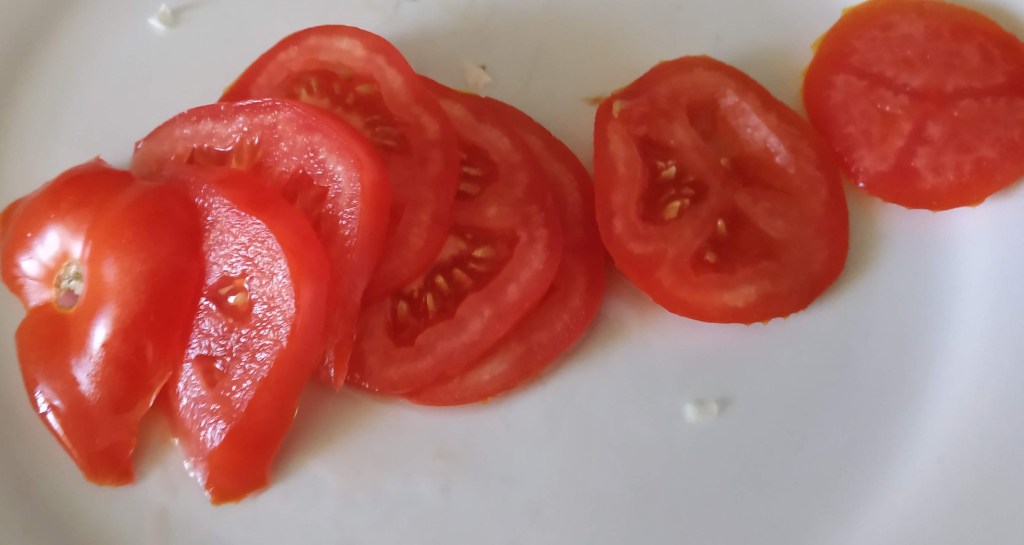 5/ Couper la tomate en fines rondelles.