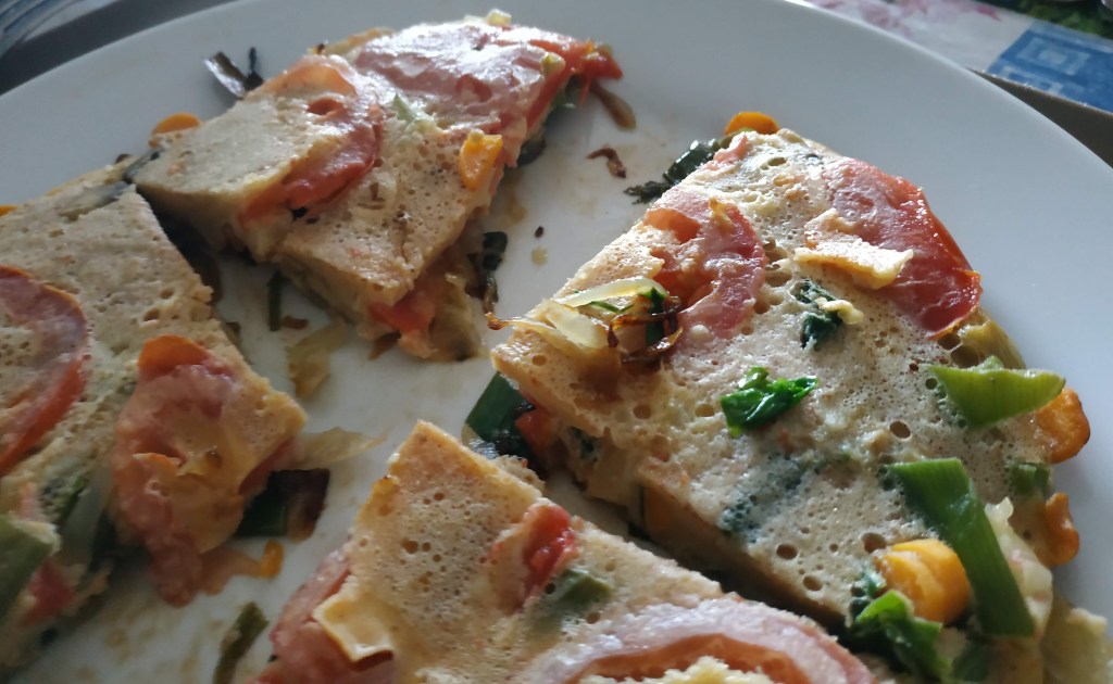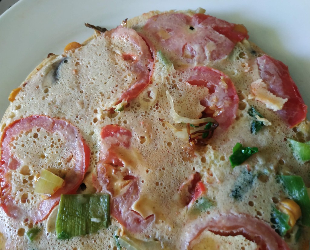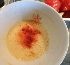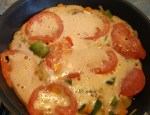 7/ Ajouter les rondelles de tomates par dessus les petits légumes puis verser l’omelette dans la poêle;