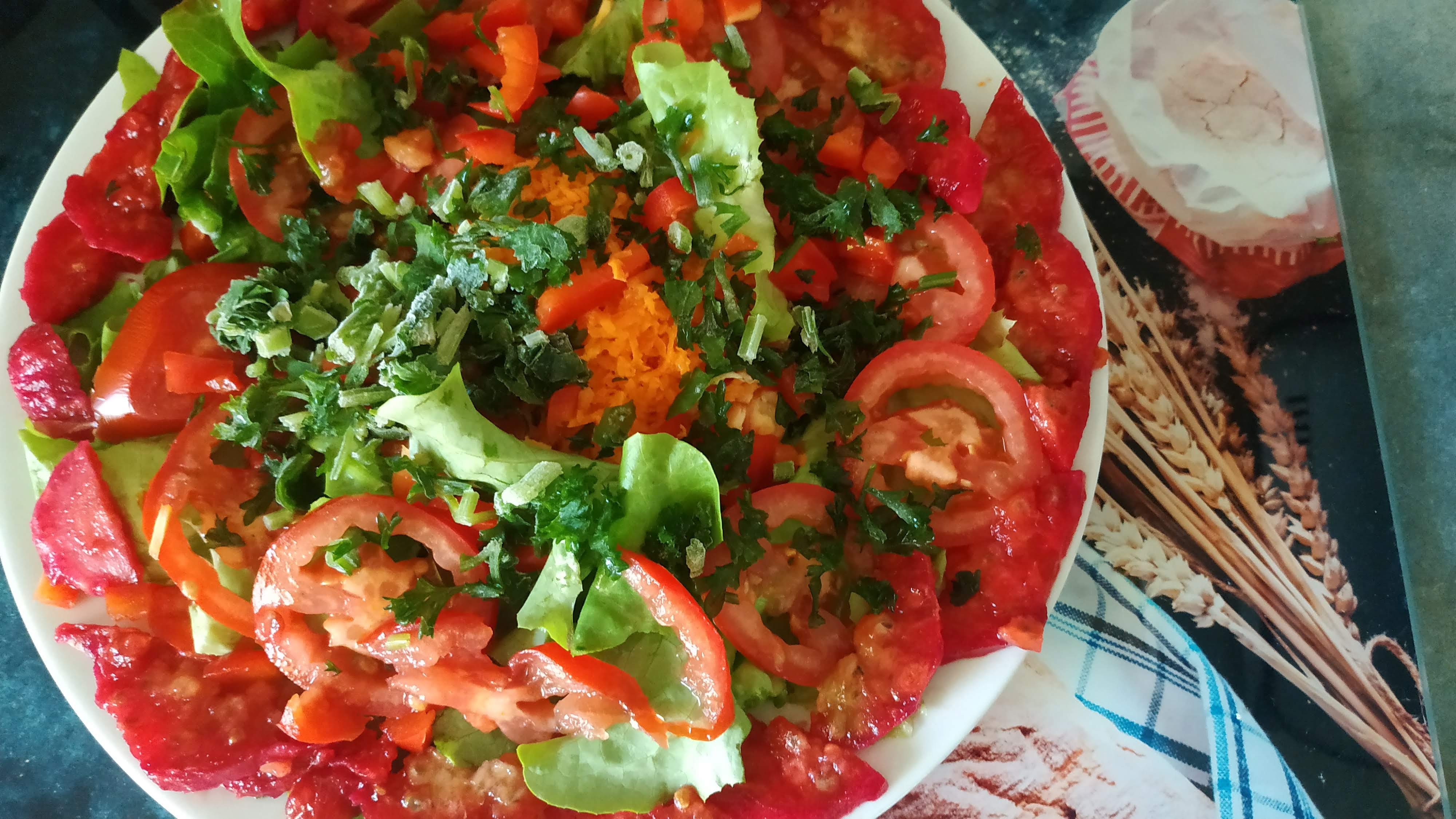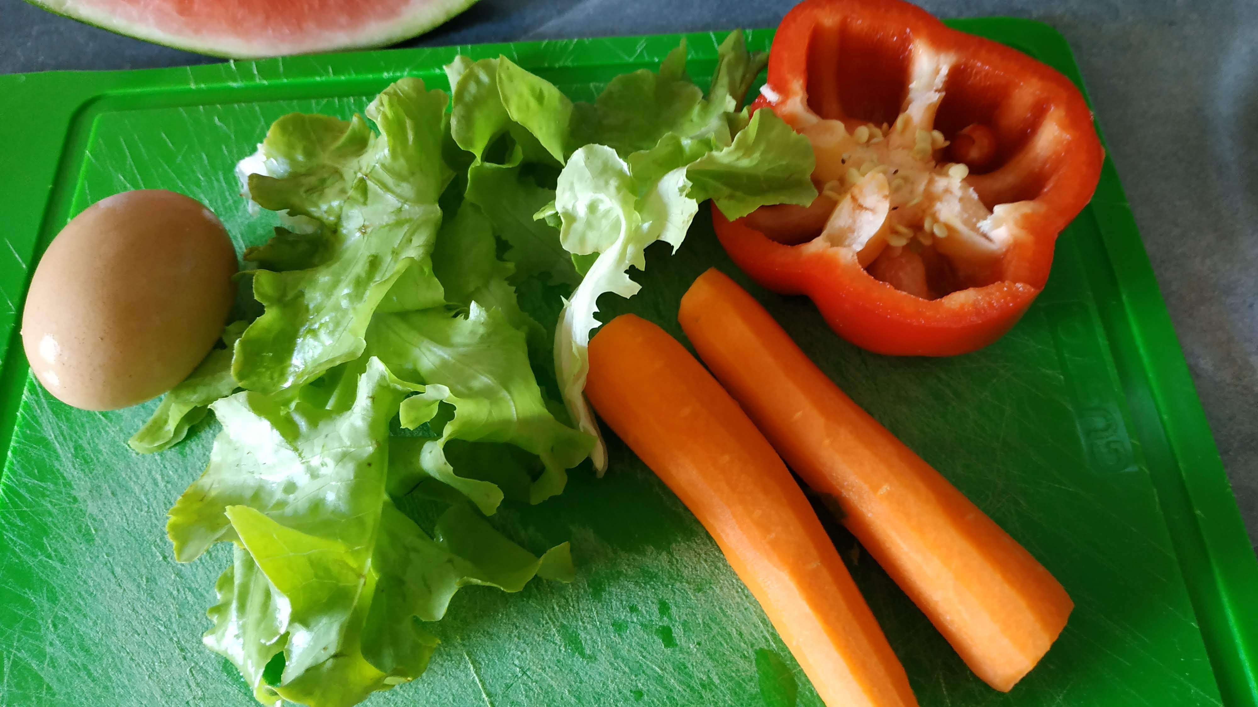 2-couper la tomate en tranches, le poivron en morceaux et râper la carotte;