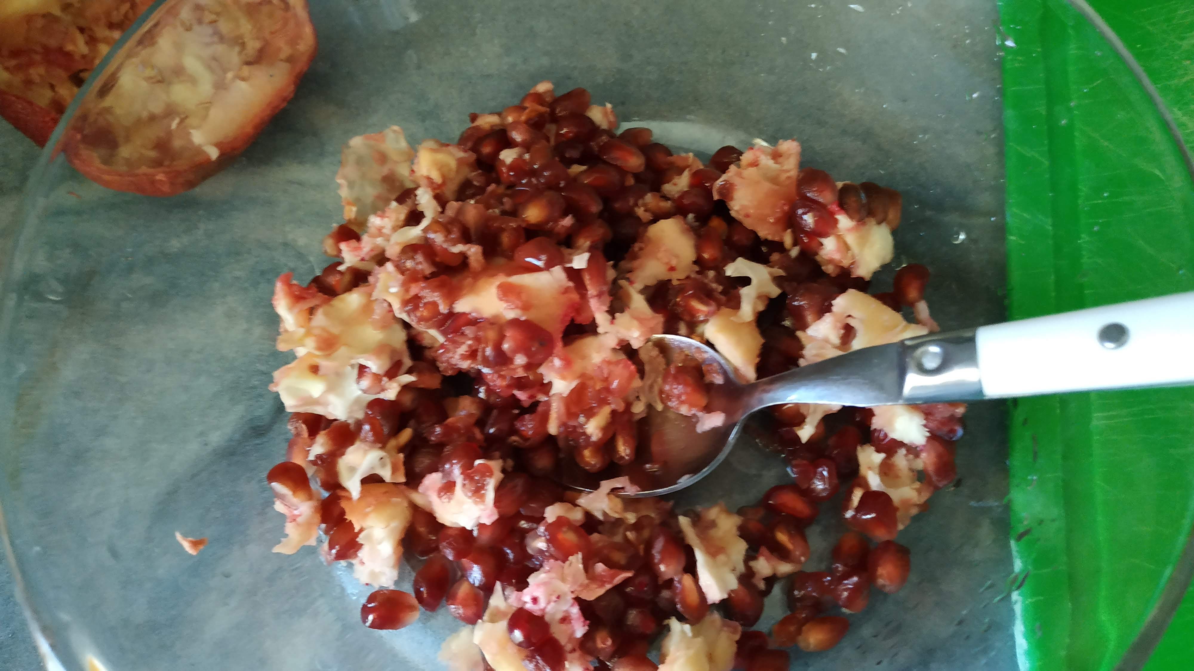 1- Laver à grande eau tous les fruits et couper la grenade en deux