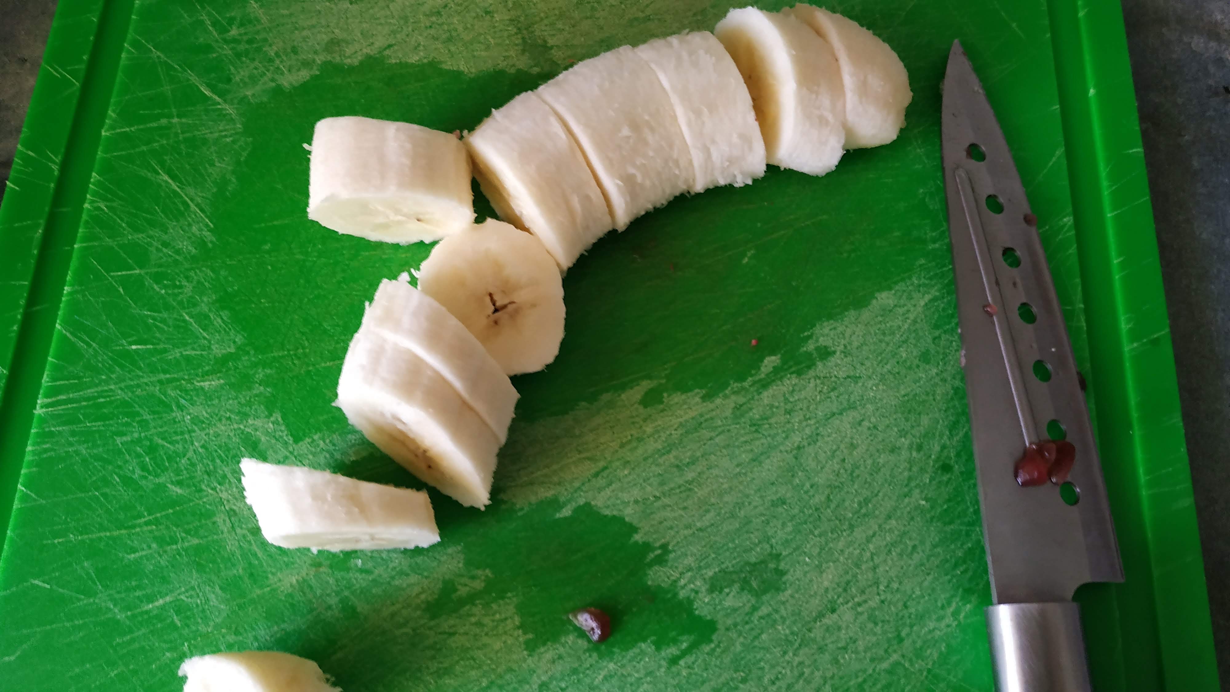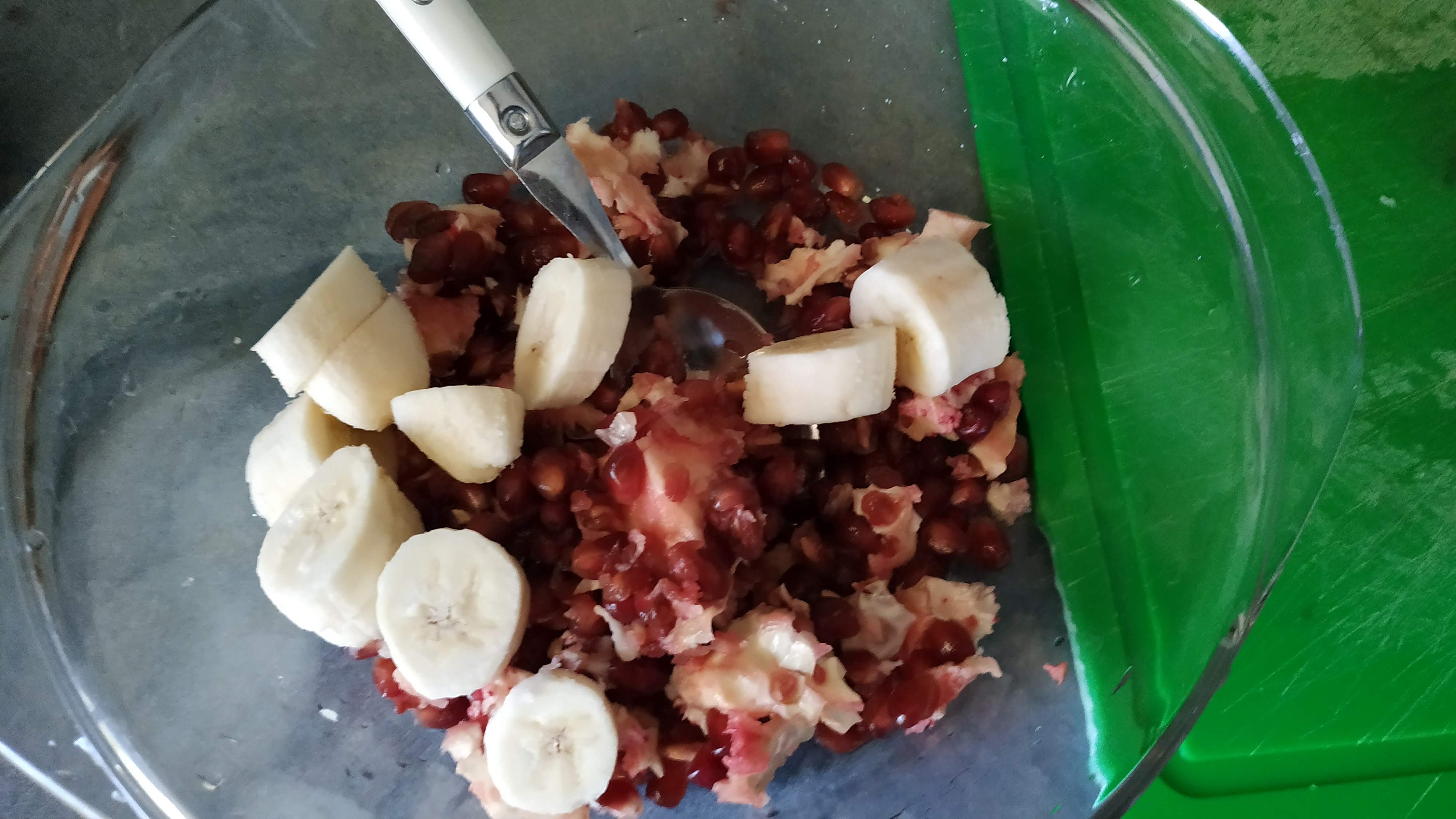 2-prelever à l’aide d’une cuillère le contenu de la grenade, et couper la banane en rondelles