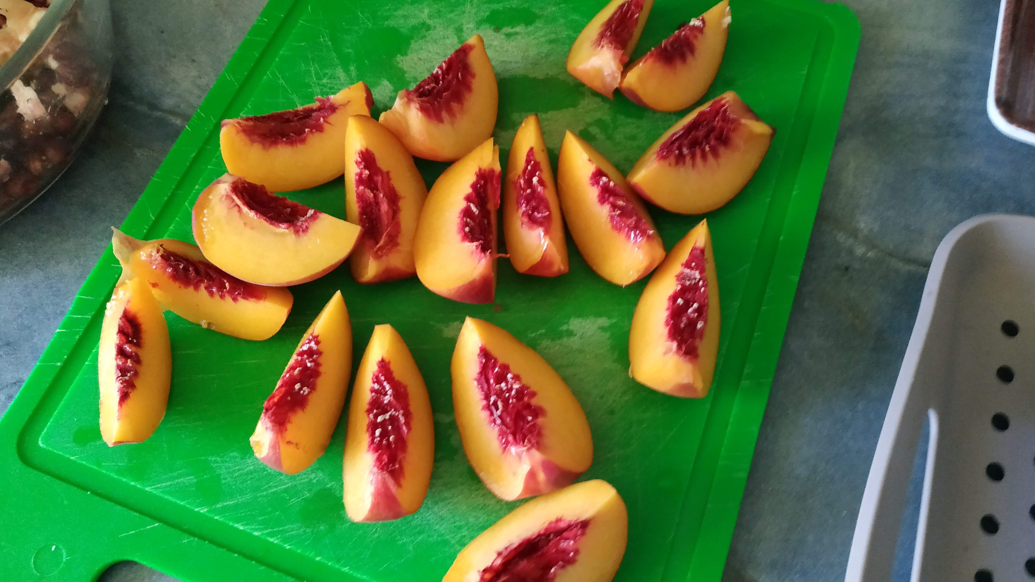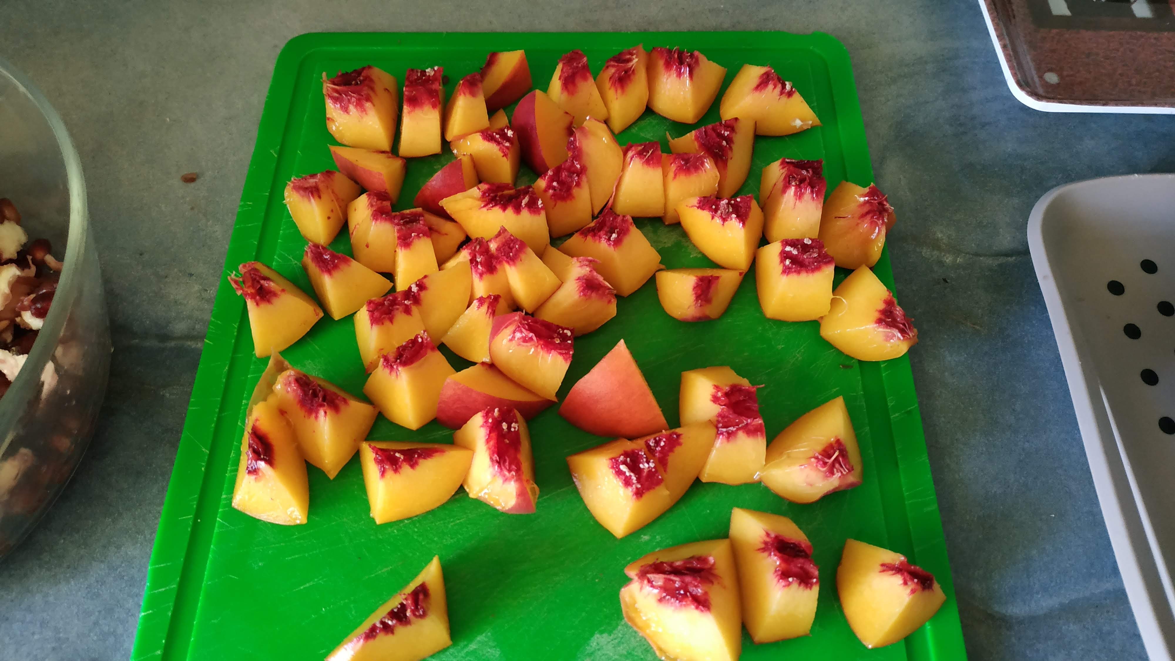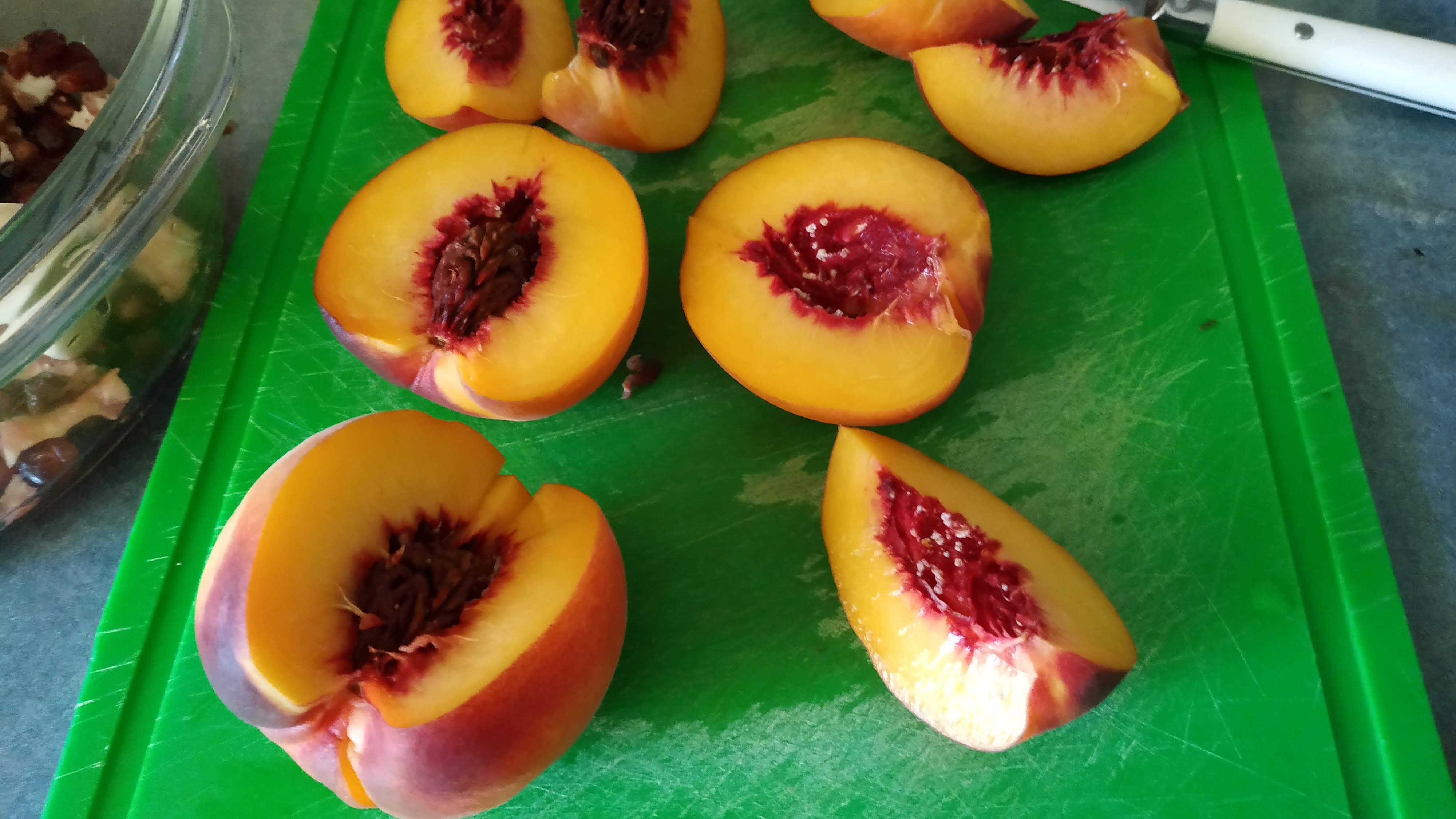 3-Couper la pêche en en deux, ôter le noyau ,puis en petits carrés pas trop gros