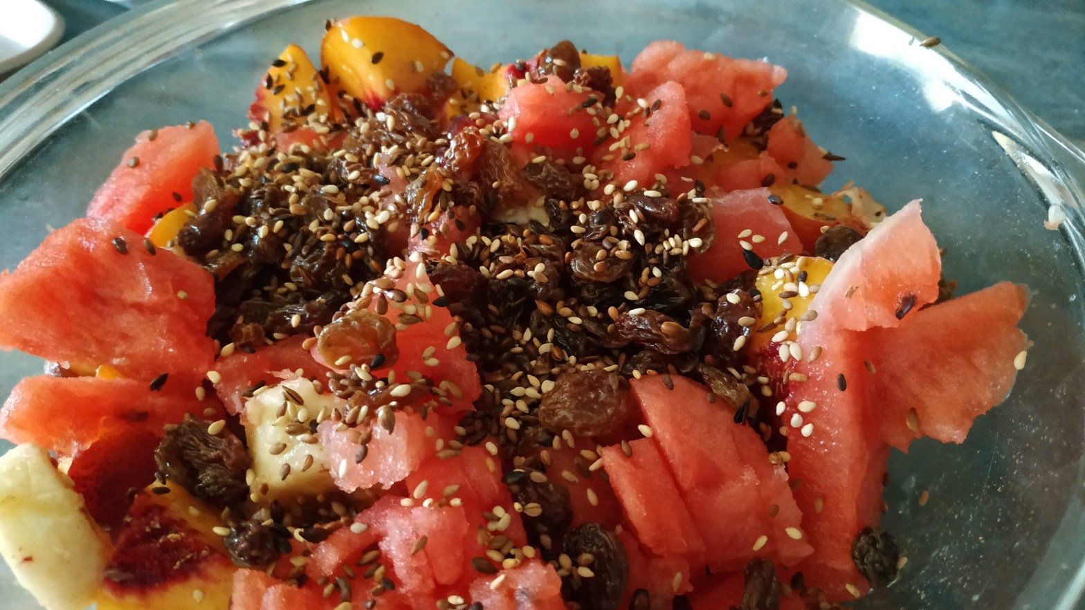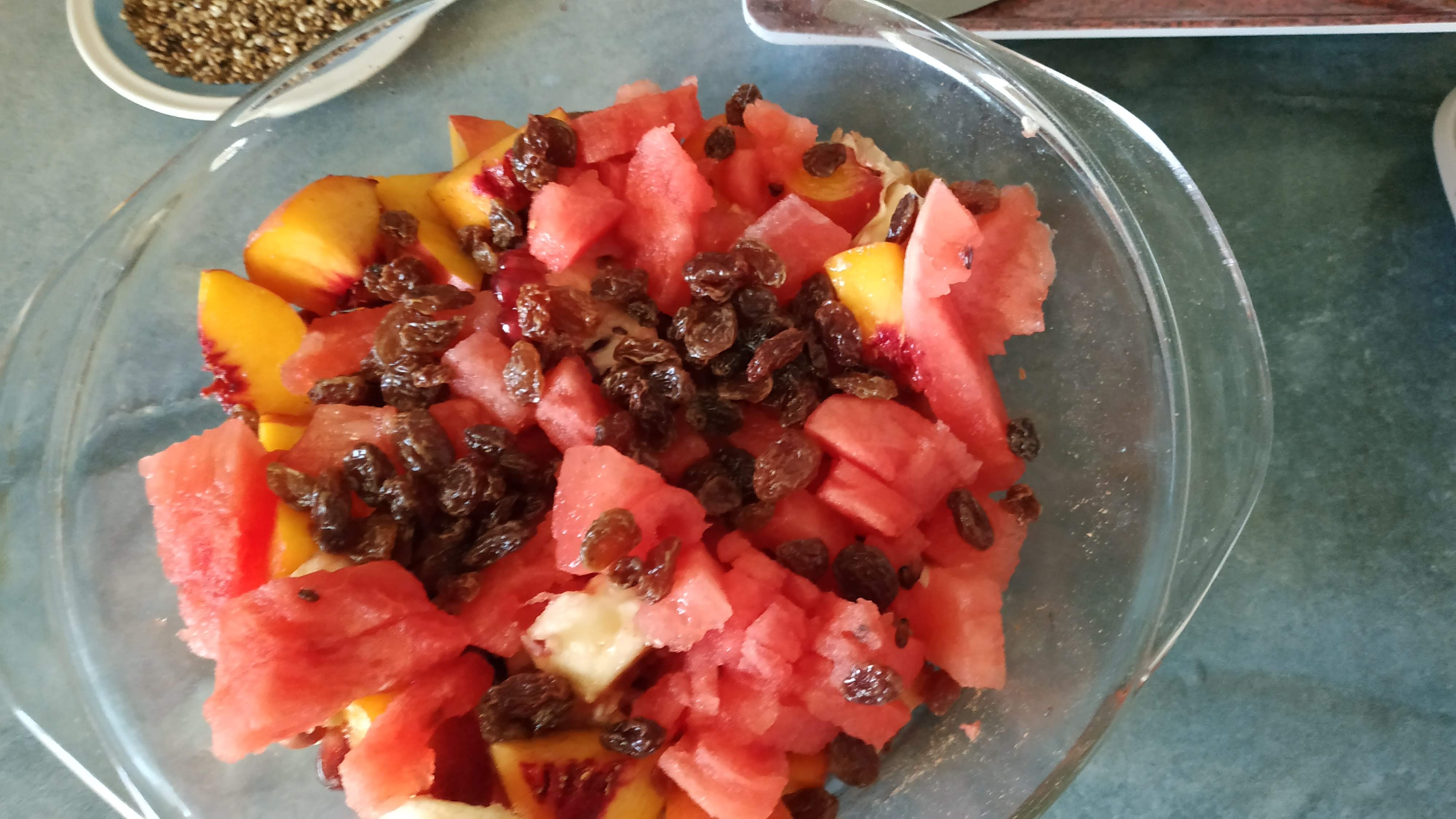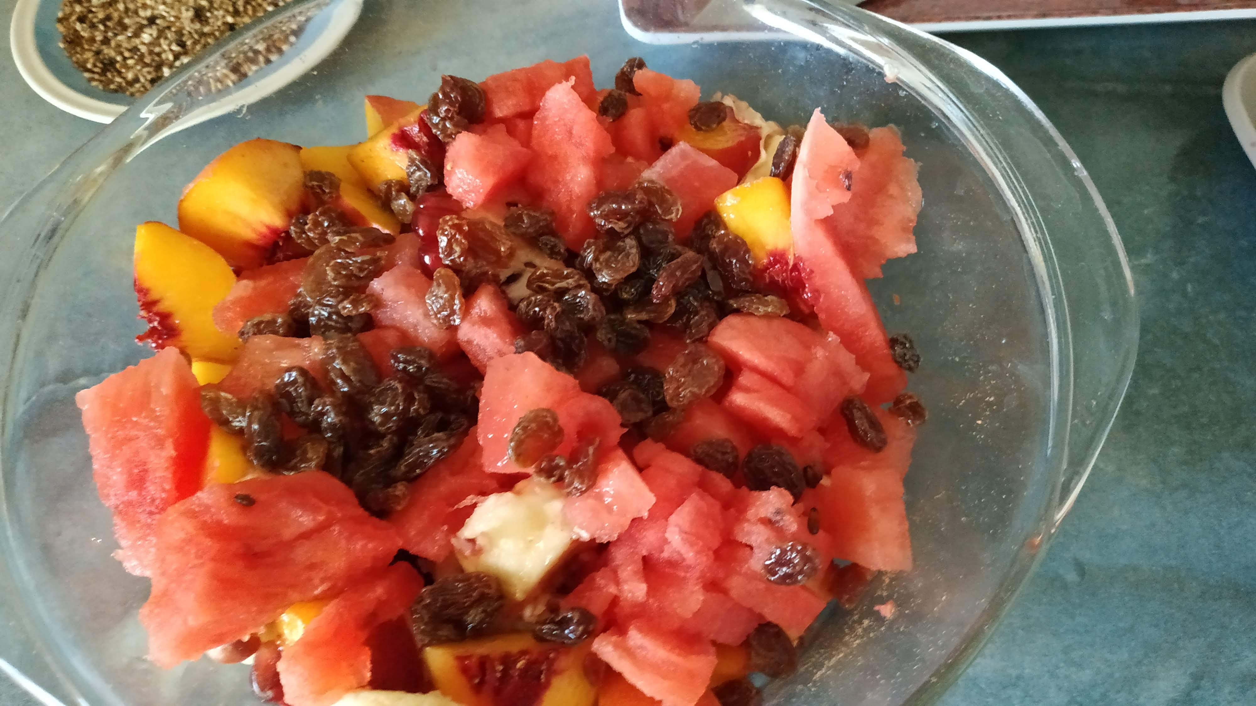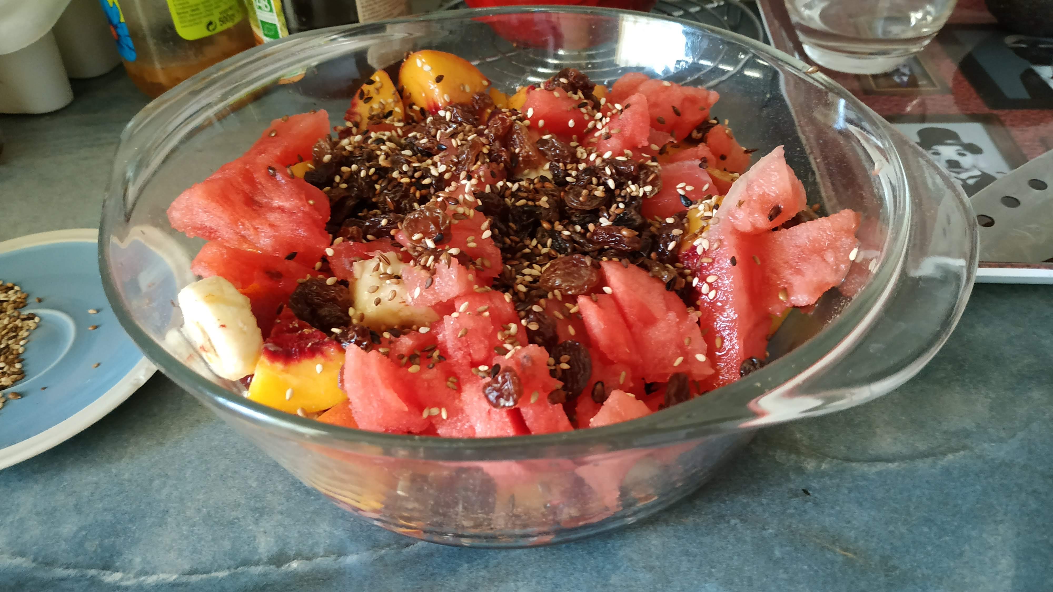une grenade , une belle tranche de pastèque, 3 pêches pas trop mûres, 1 banane, une poignée de raisins de Corinthe, 1 Cs de graines de sésame et 1 Cs de graines de lin;