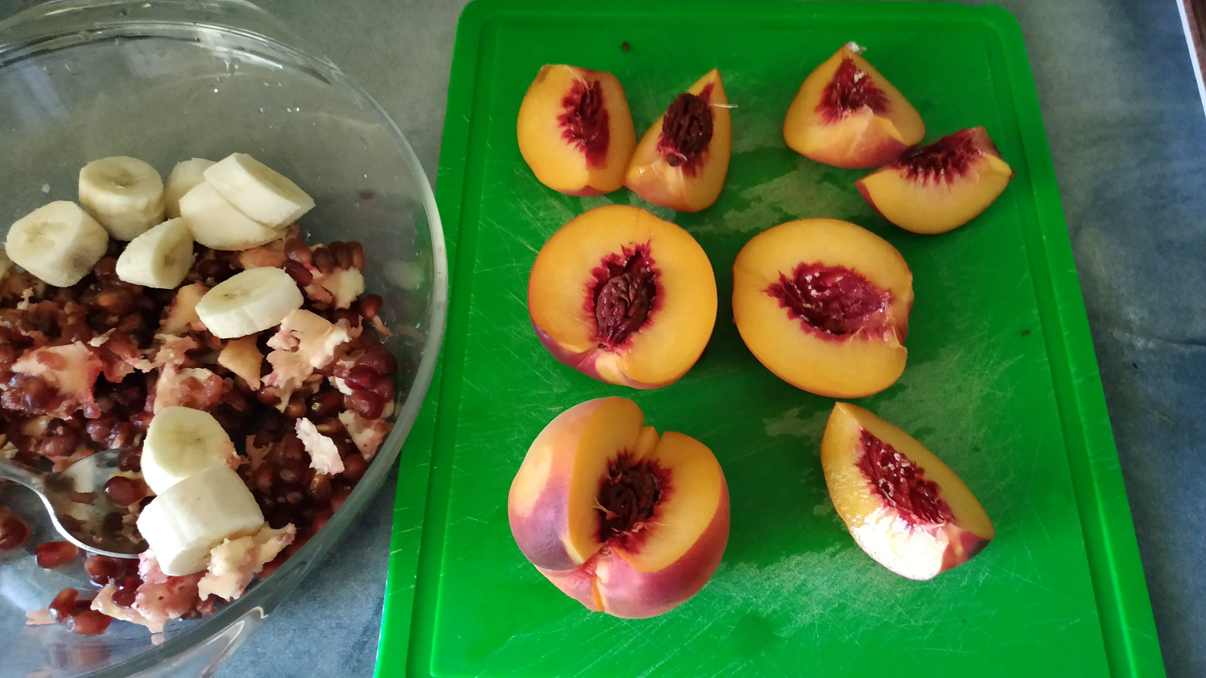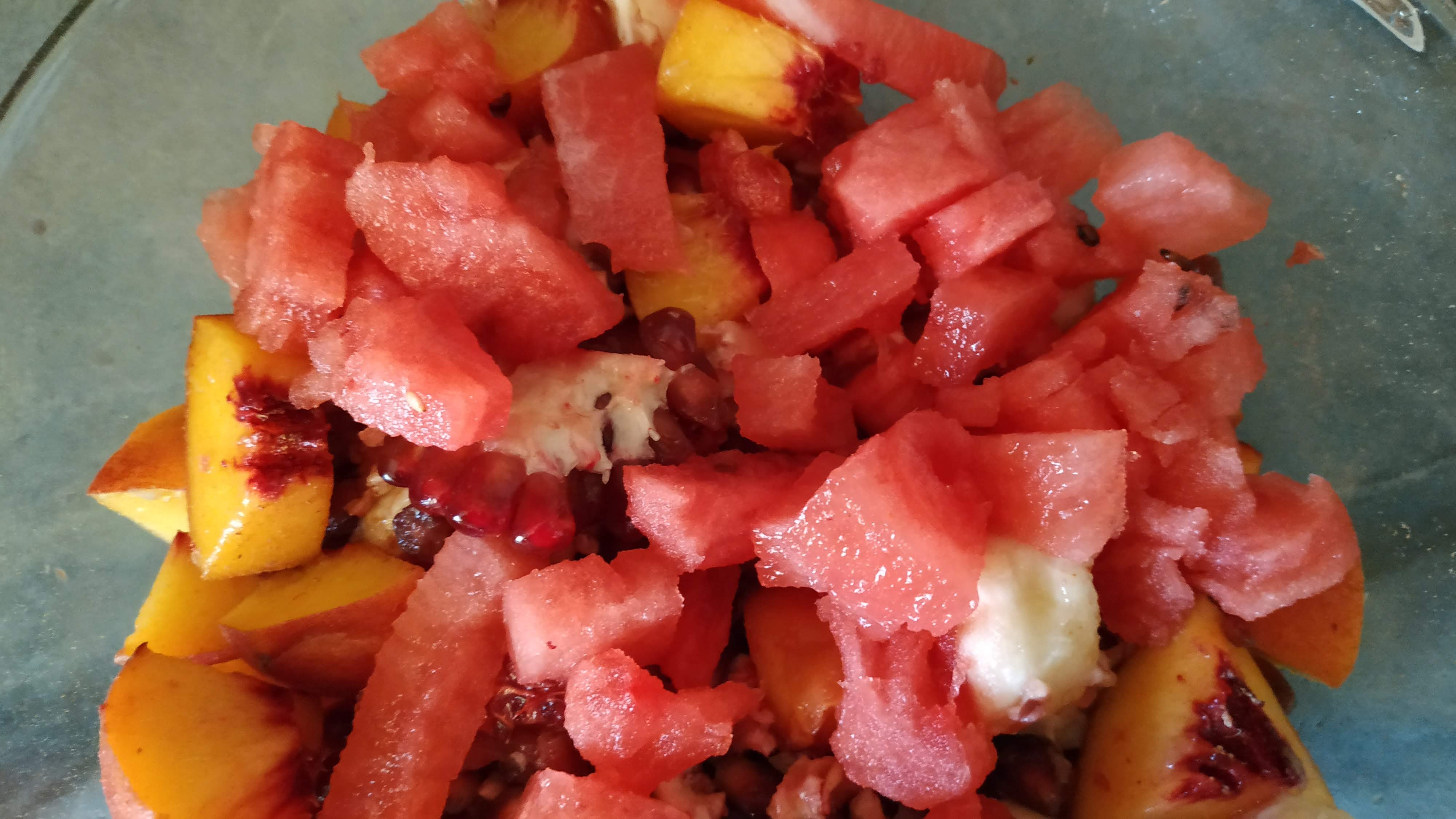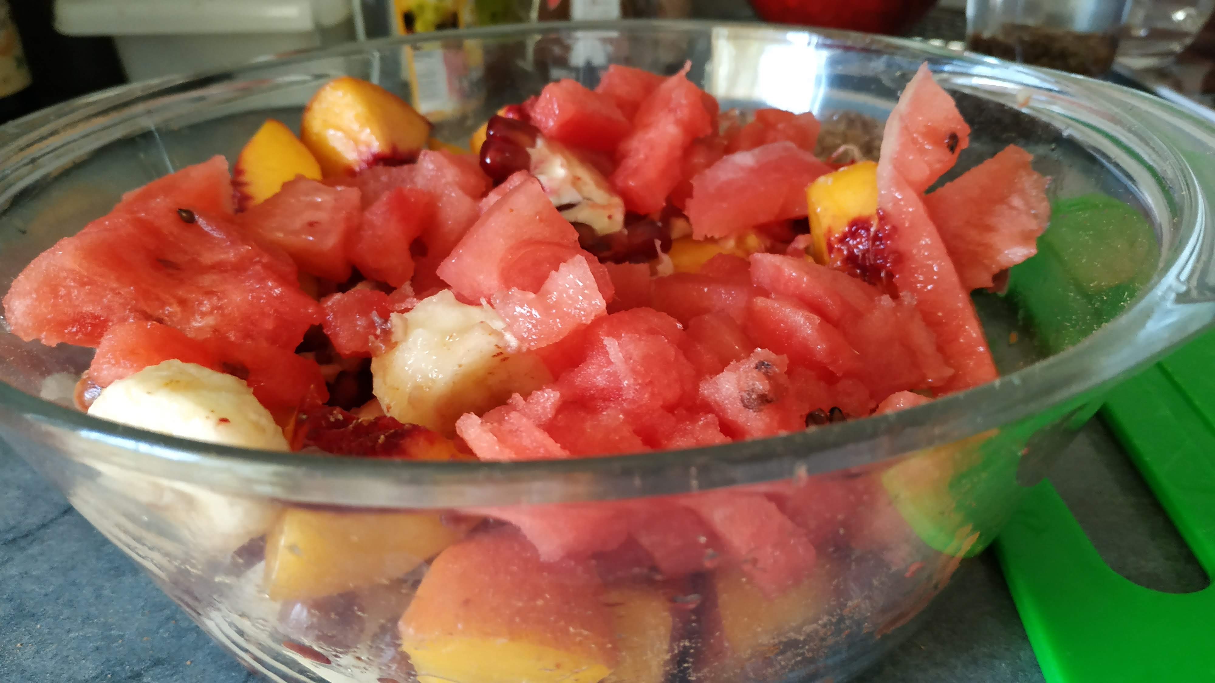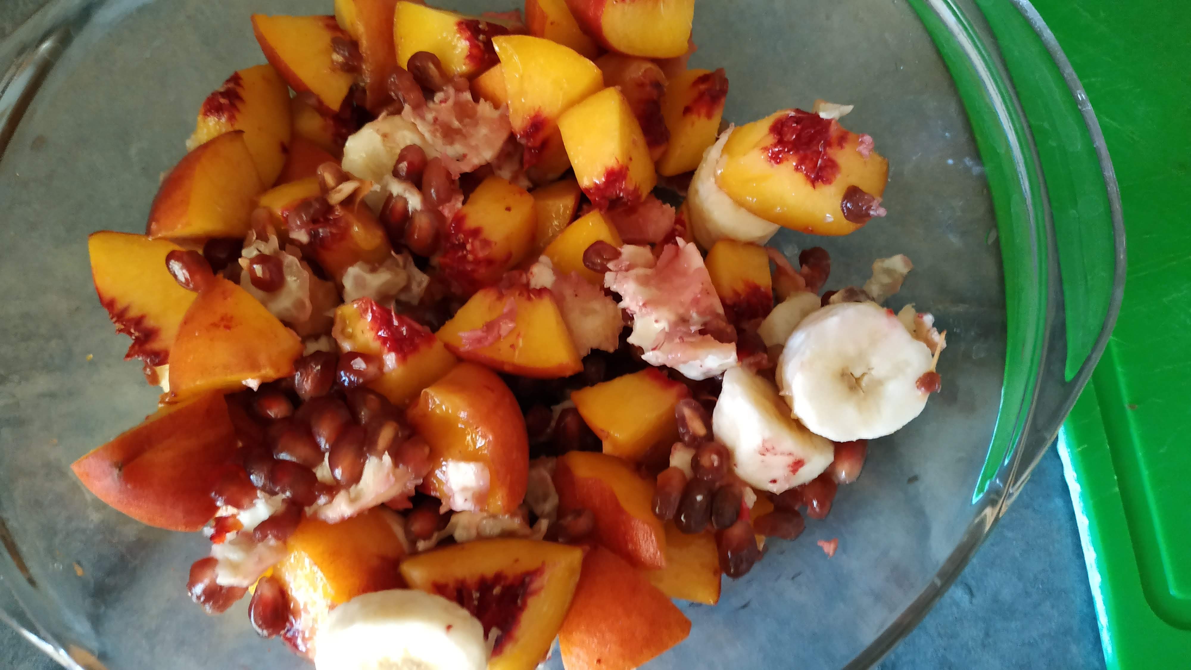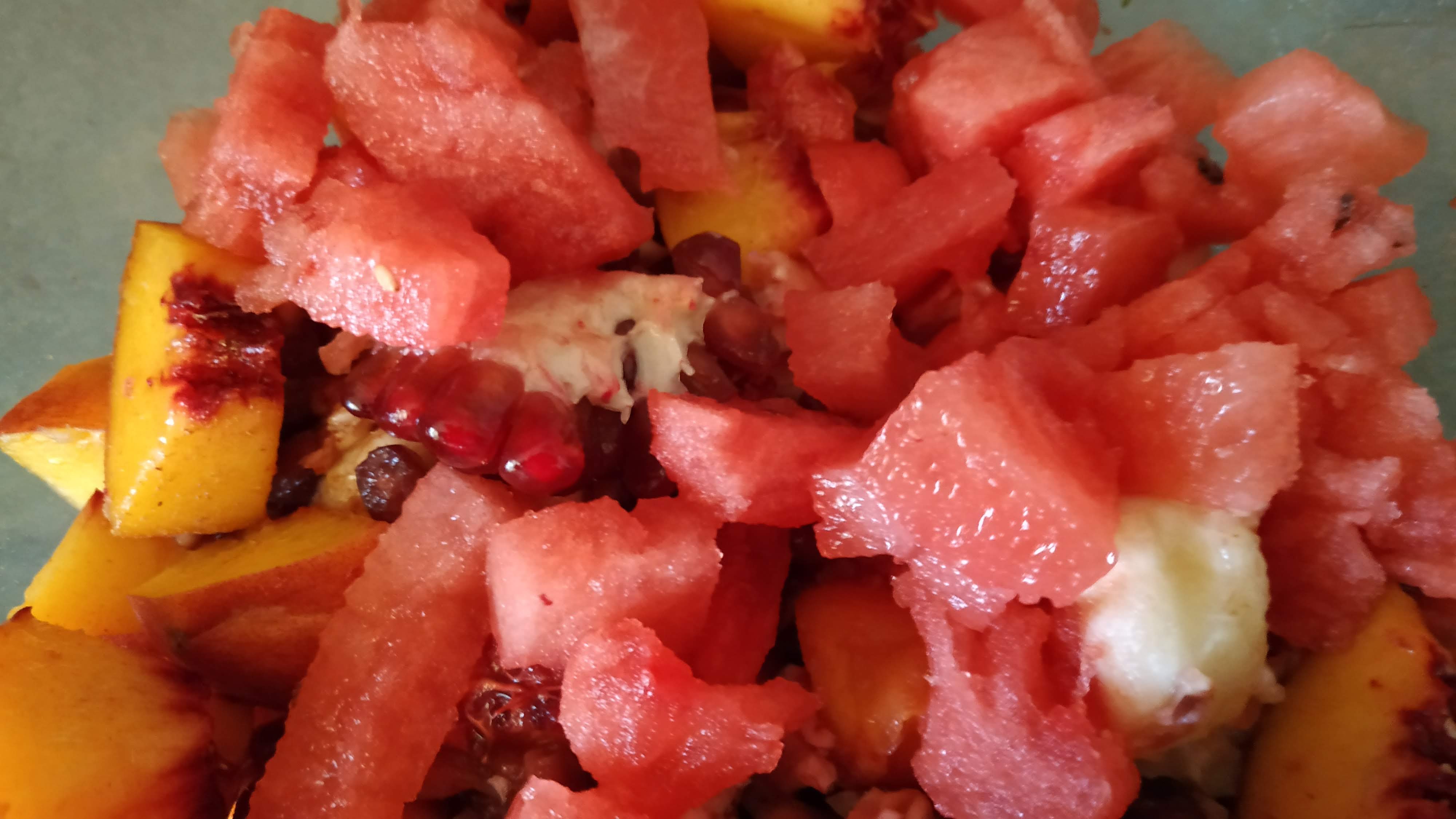 une grenade , une belle tranche de pastèque, 3 pêches pas trop mûres, 1 banane, une poignée de raisins de Corinthe, 1 Cs de graines de sésame et 1 Cs de graines de lin;
