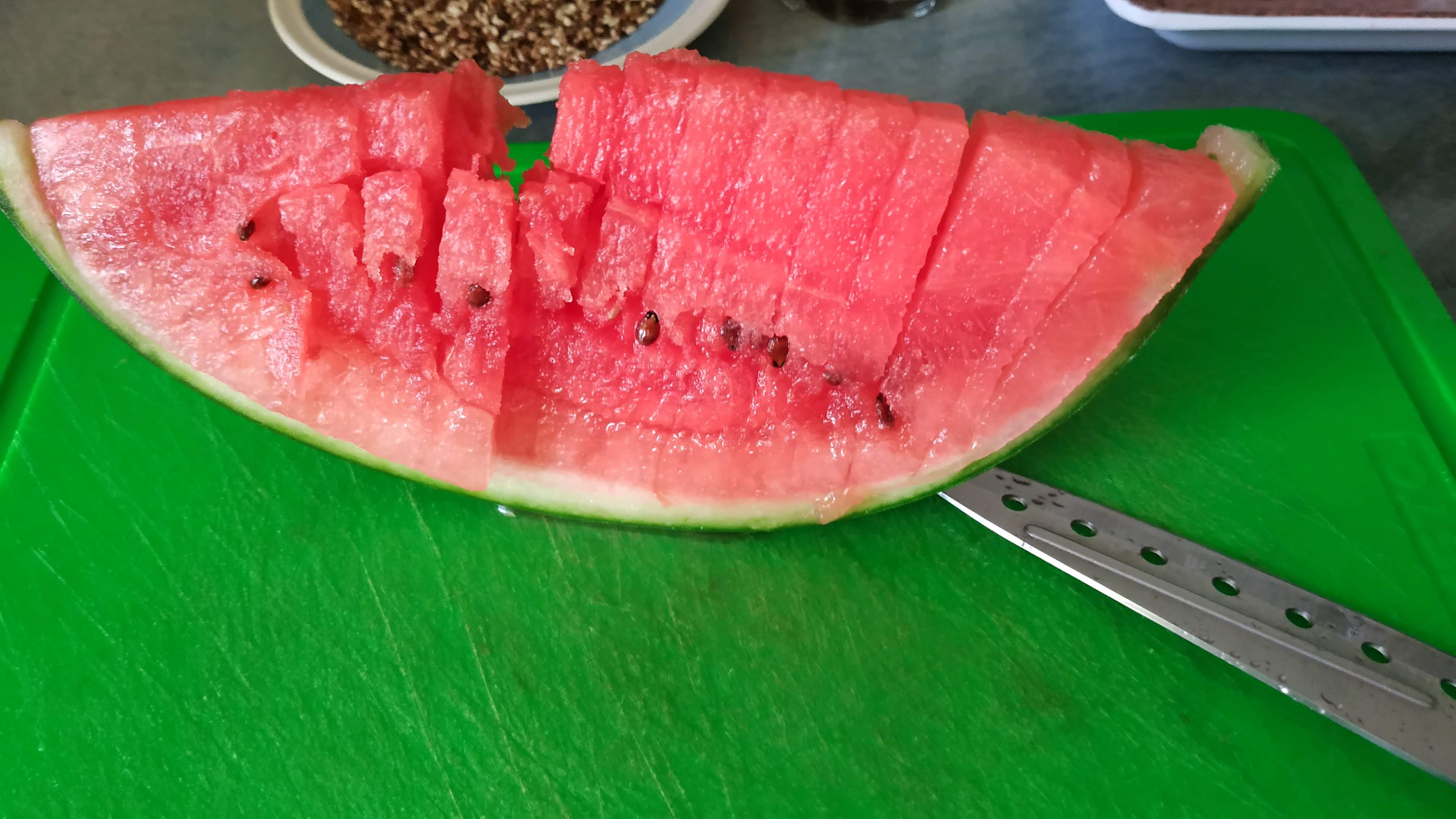 6-Couper la tranche de pastèque en morceaux après avoir enlevé la peau.