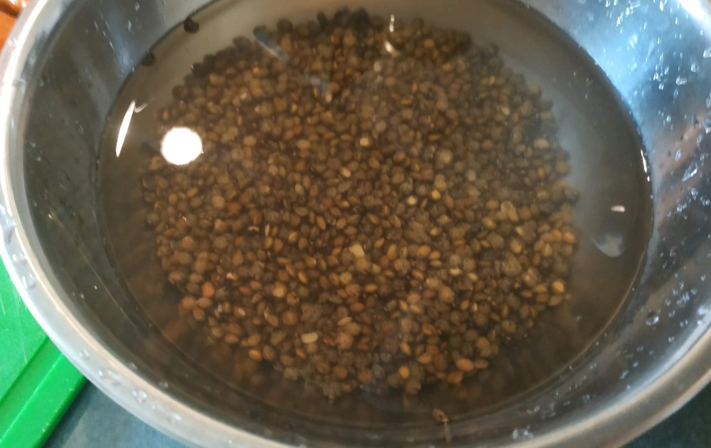 Après quelques minutes, ajoutez les lentilles préalablement égouttées. Mélangez, puis couvrez avec 500 ml d’eau froide. Laissez cuire pendant 20 à 25 minutes à feu doux.