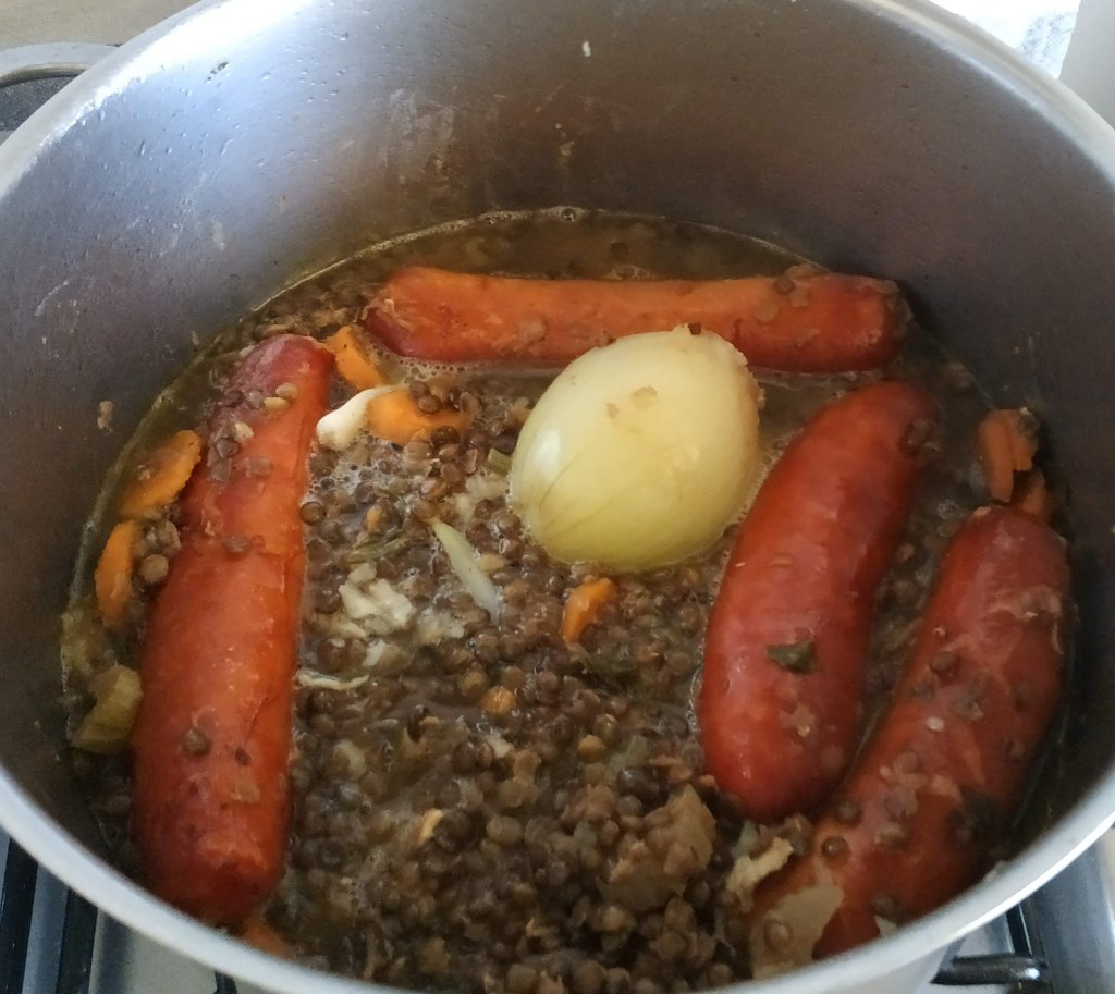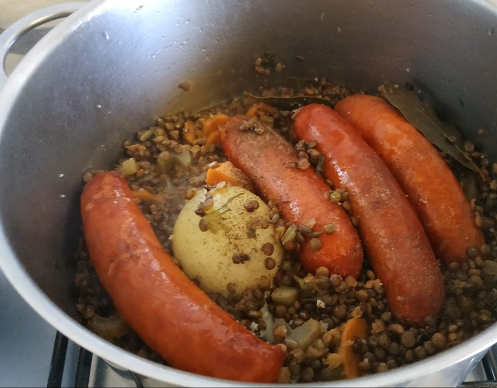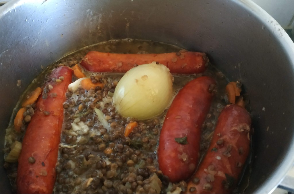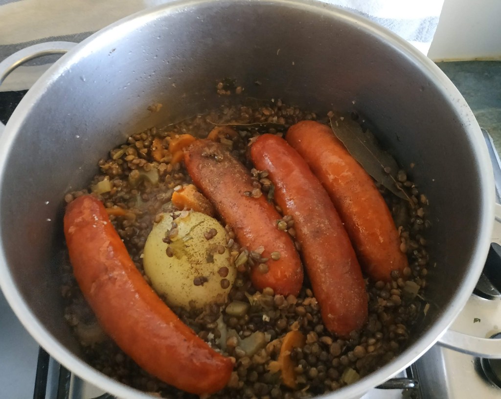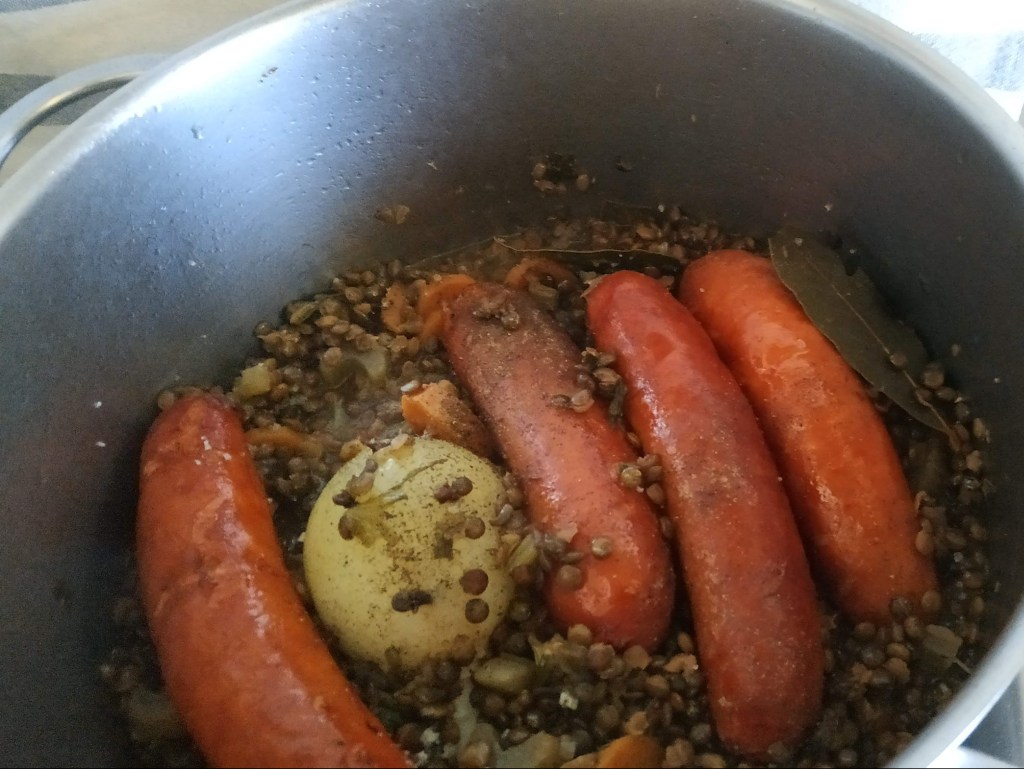 Voici une petite recette simple avec des saucisses, et facilement réalisable chez vous ,que j’ai dénichée pour vous ; qui vous apportera tous les ingrédients nécessaires, et qui vous permettra d’affronter l’hiver en toute sérénité. Les lentilles et toutes les légumineuses sont riches en protéines ( 100gr de lentilles en possèdent autant que 100gr de viande ou 100gr de poissons) mais aussi en minéraux: fer, magnésium, calcium, potassium( elles sont championnes pour leur teneur en potassium),et en vitamines A, et vitamines du groupe B.