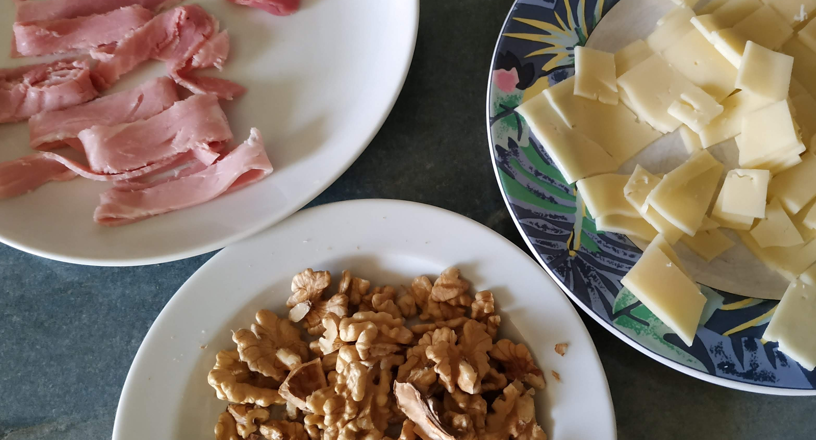 2-Dans une assiette, mettre l’endive coupée en morceaux ,la pomme coupée en petits carrés, le jambon et le fromage coupés en morceaux et les cerneaux de noix hachés grossièrement; puis les tomates coupées en deux.