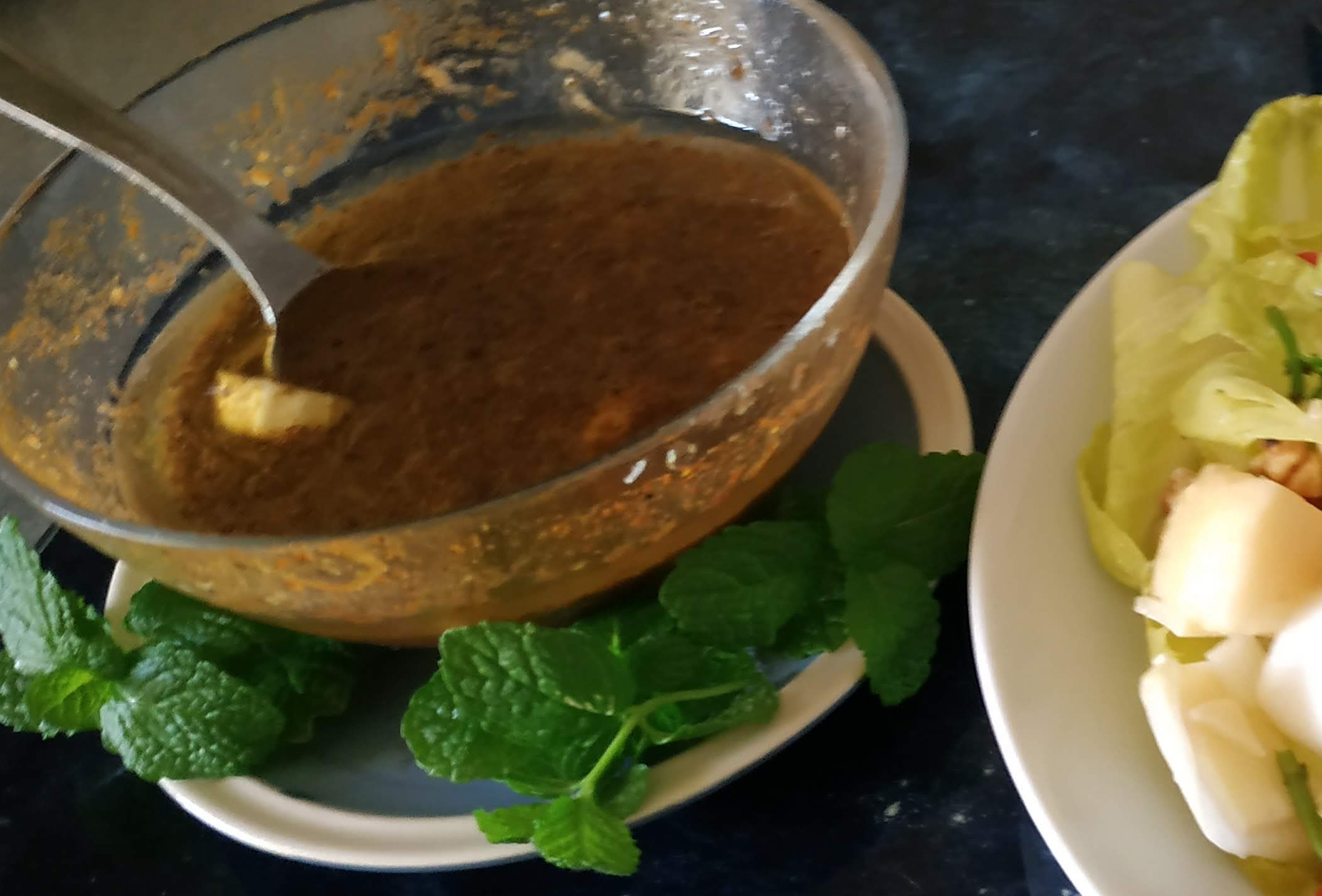 - pour la sauce: tapenade d’olives noires, huile d’olive, vinaigre de cidre,1 gousse d’ail, sel, poivre)