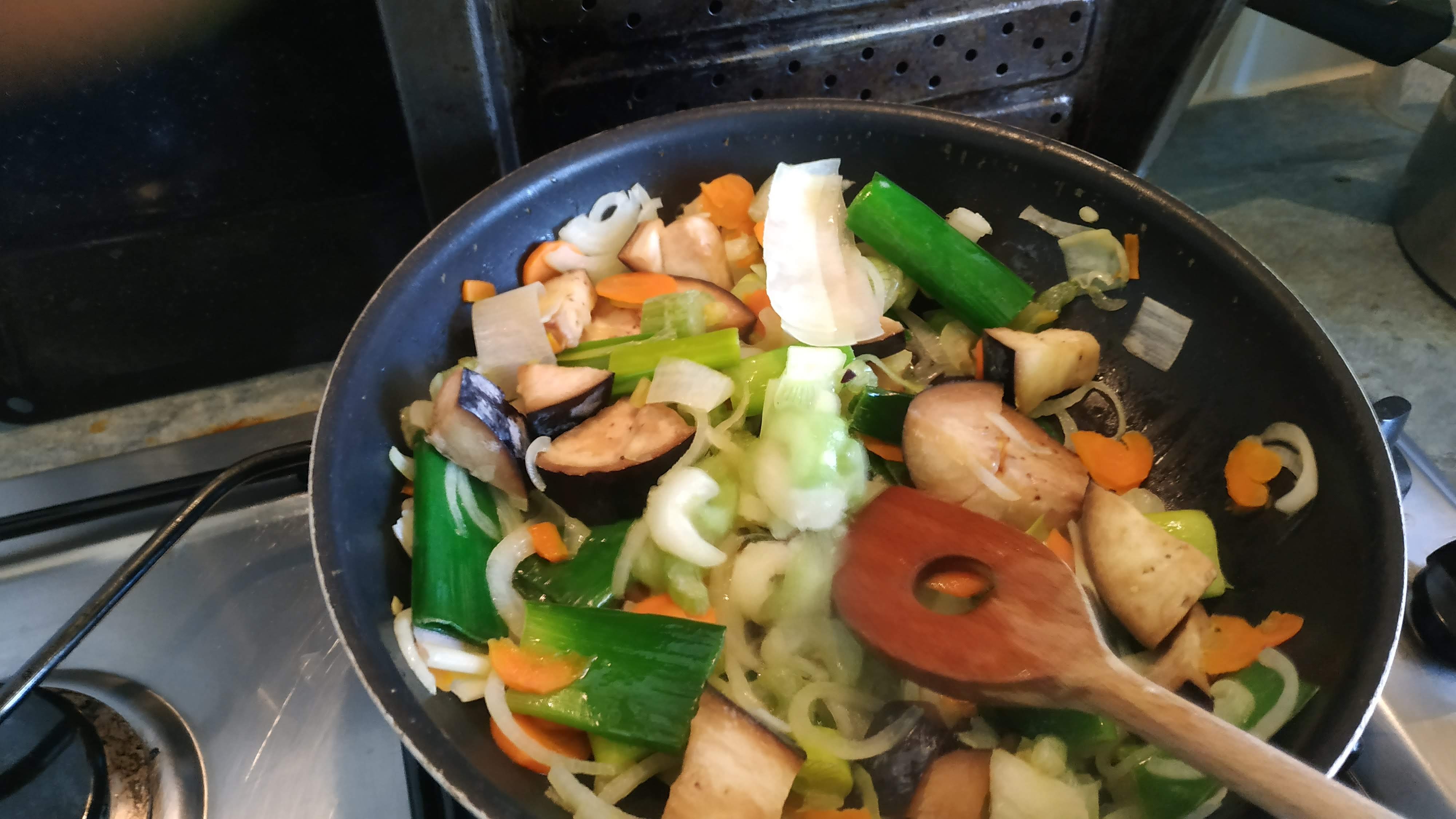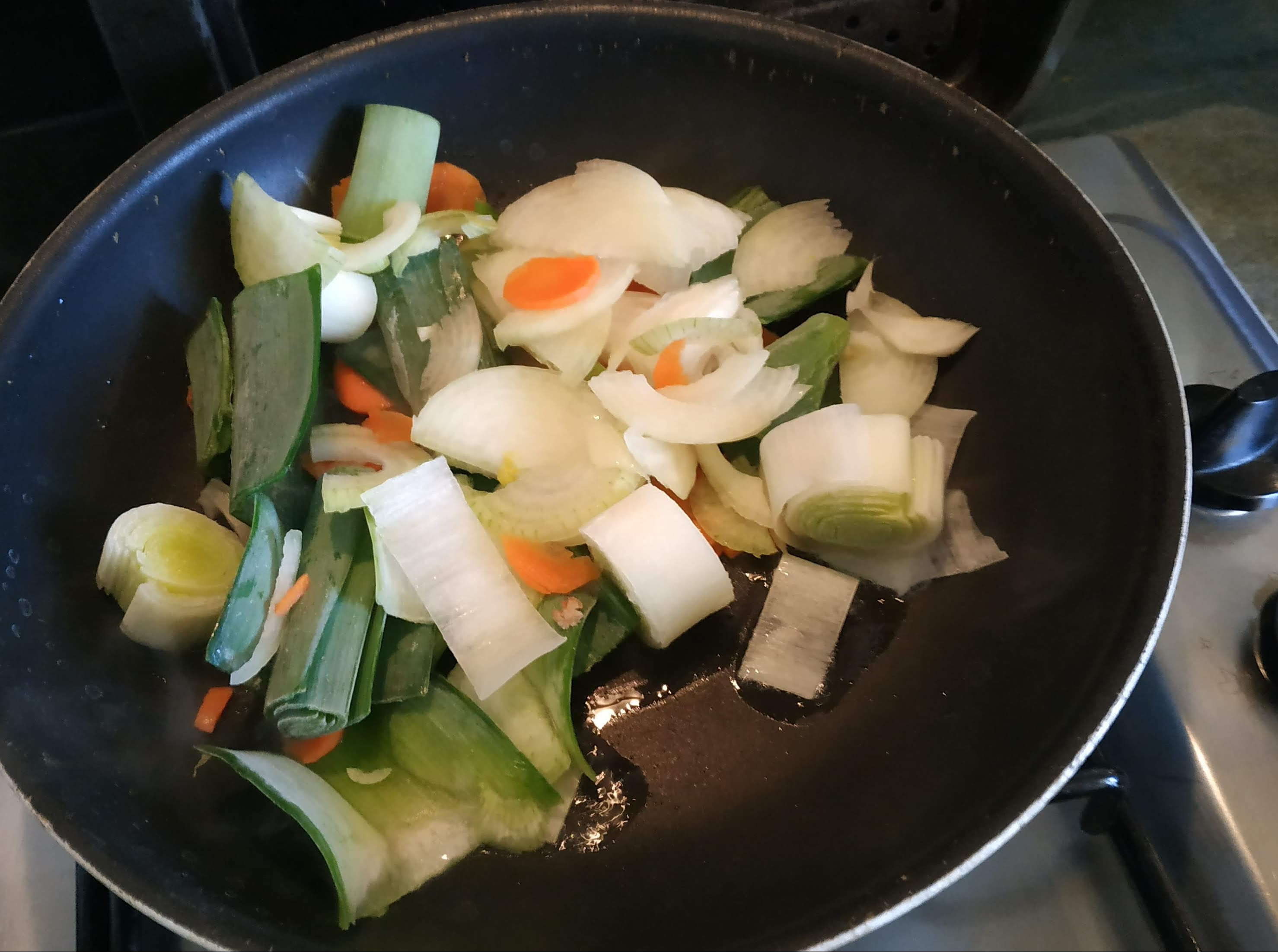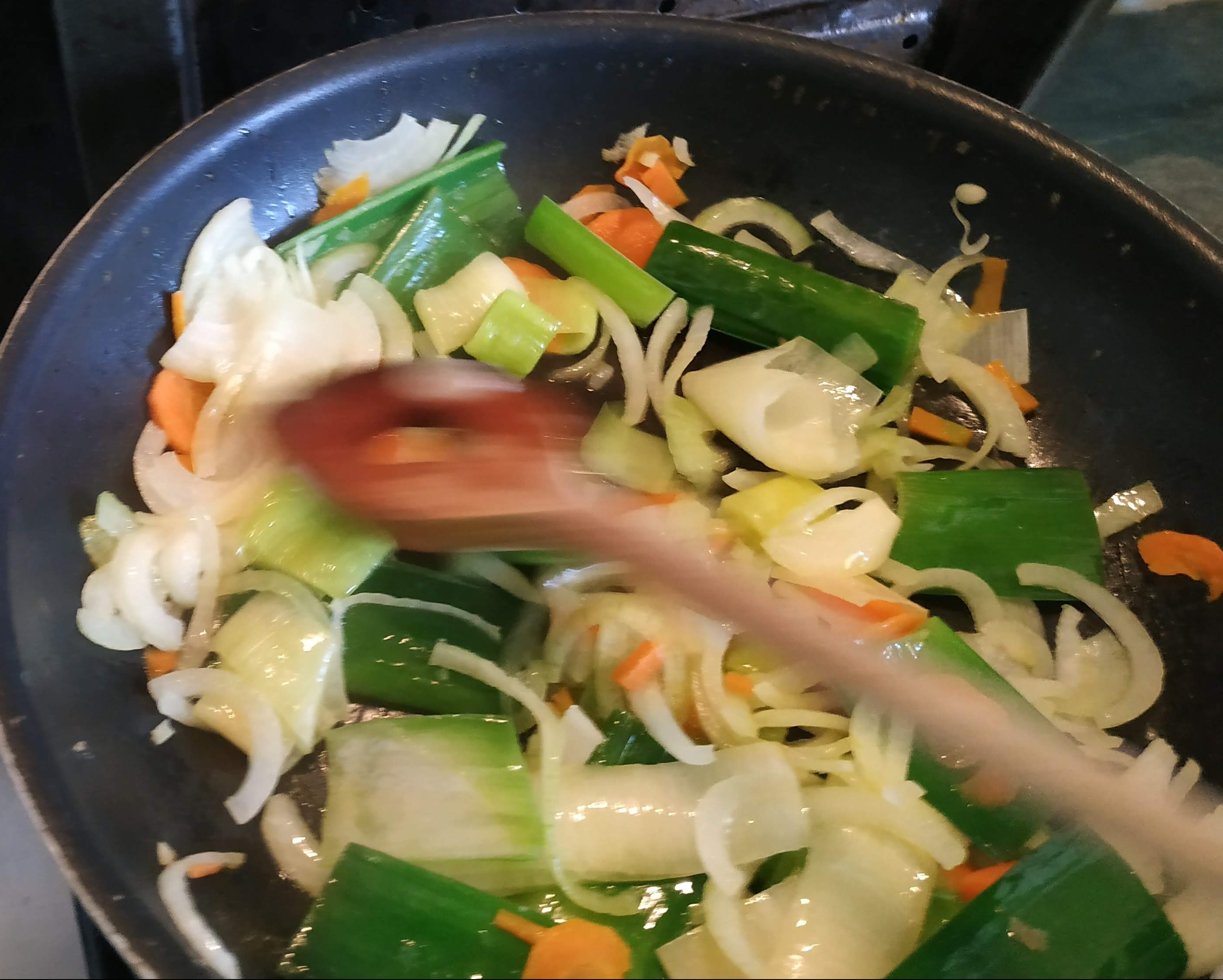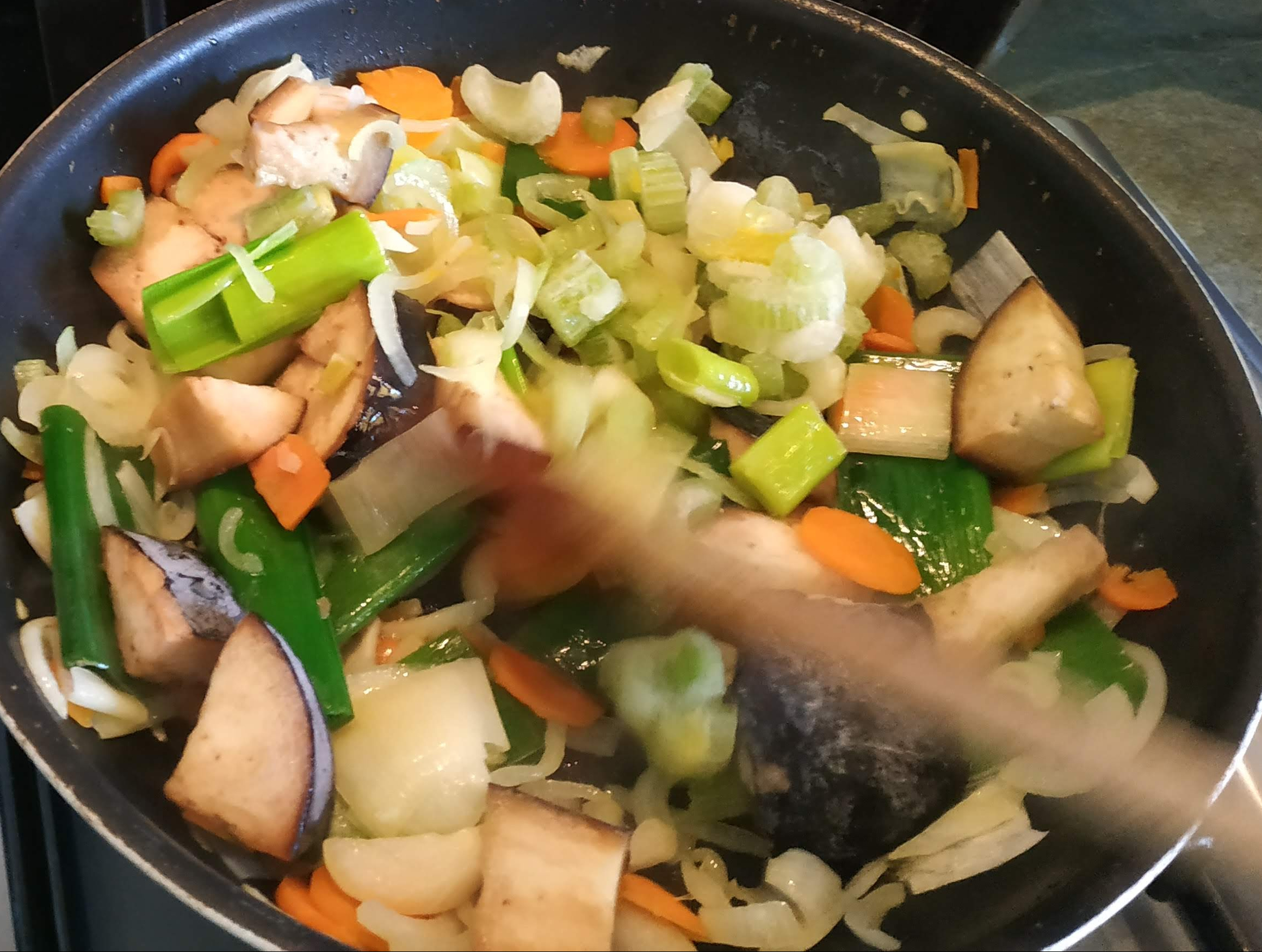 3-Dans une poêle chaude, faire revenir avec l’huile les légumes coupés :carotte, poireau, aubergine, ognon, cèleri quelques 5 minutes environ, en remuant de temps en temps.