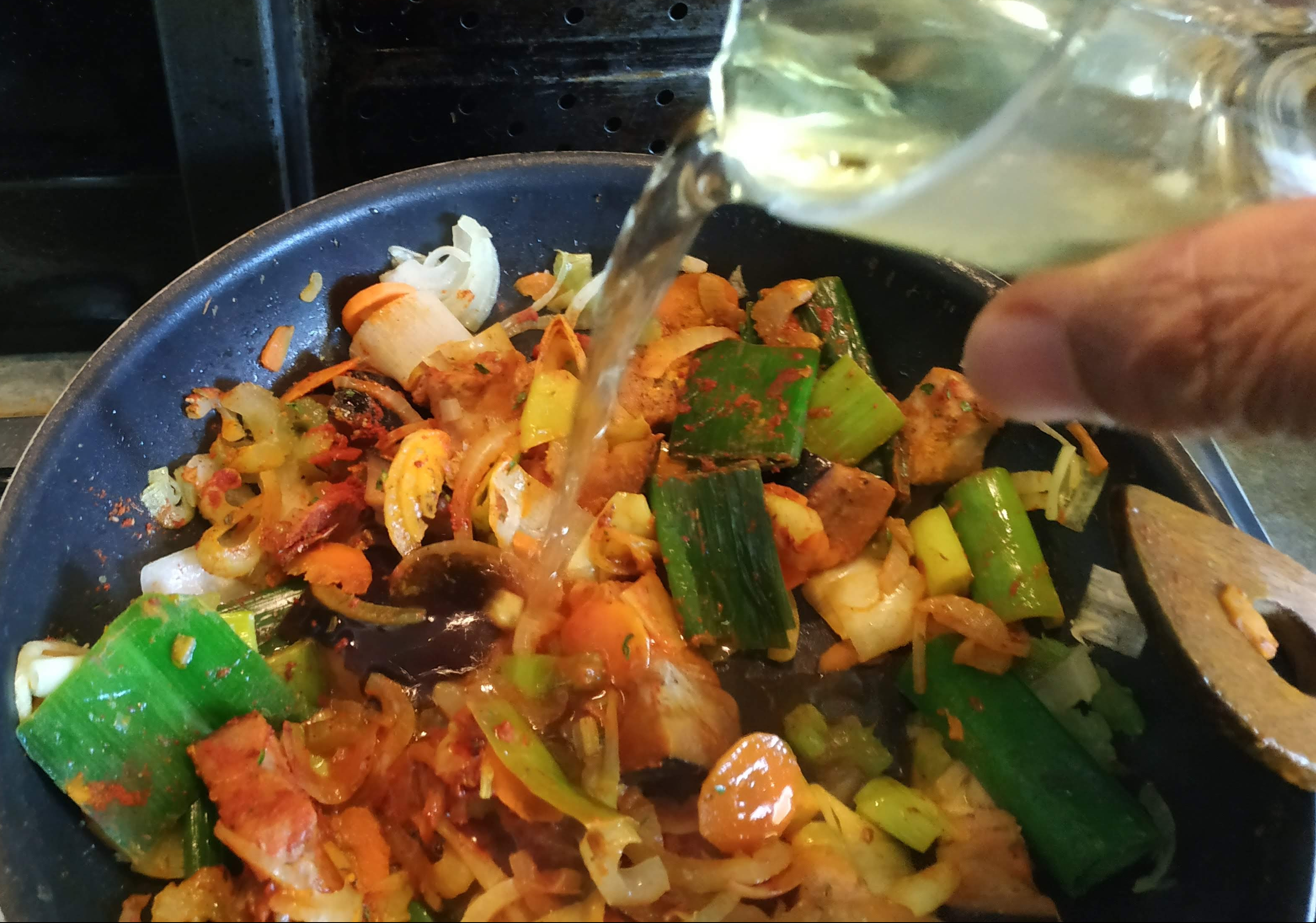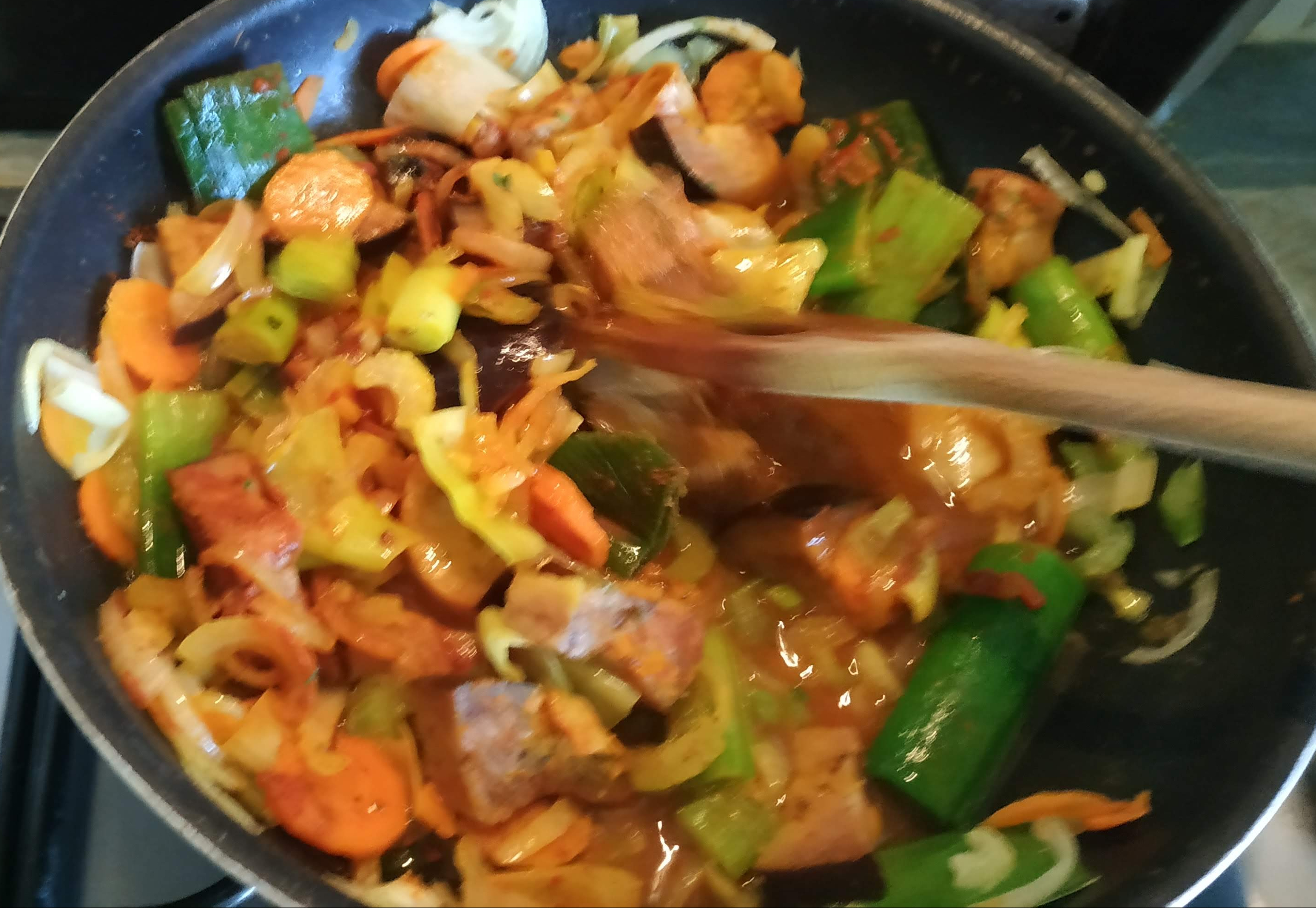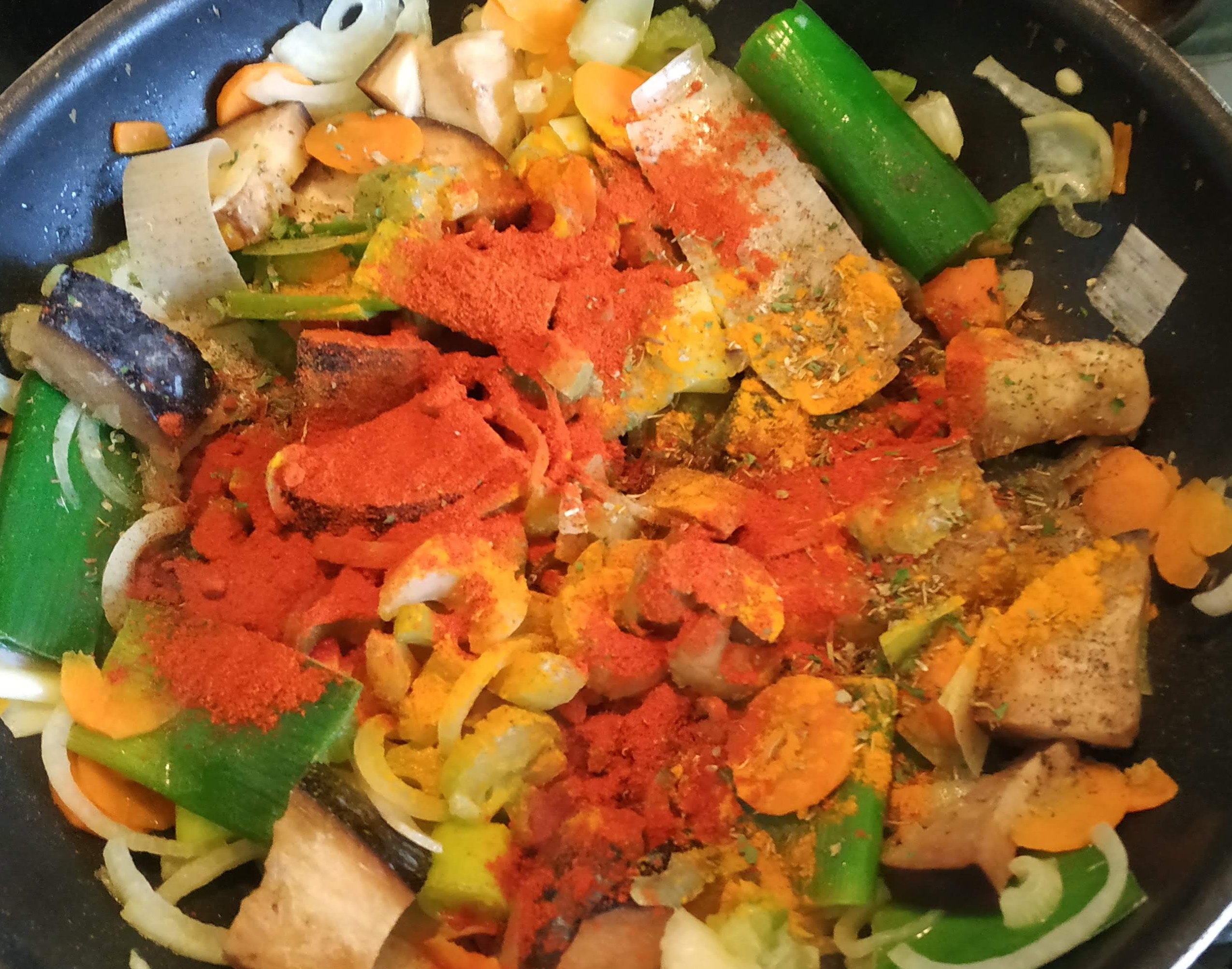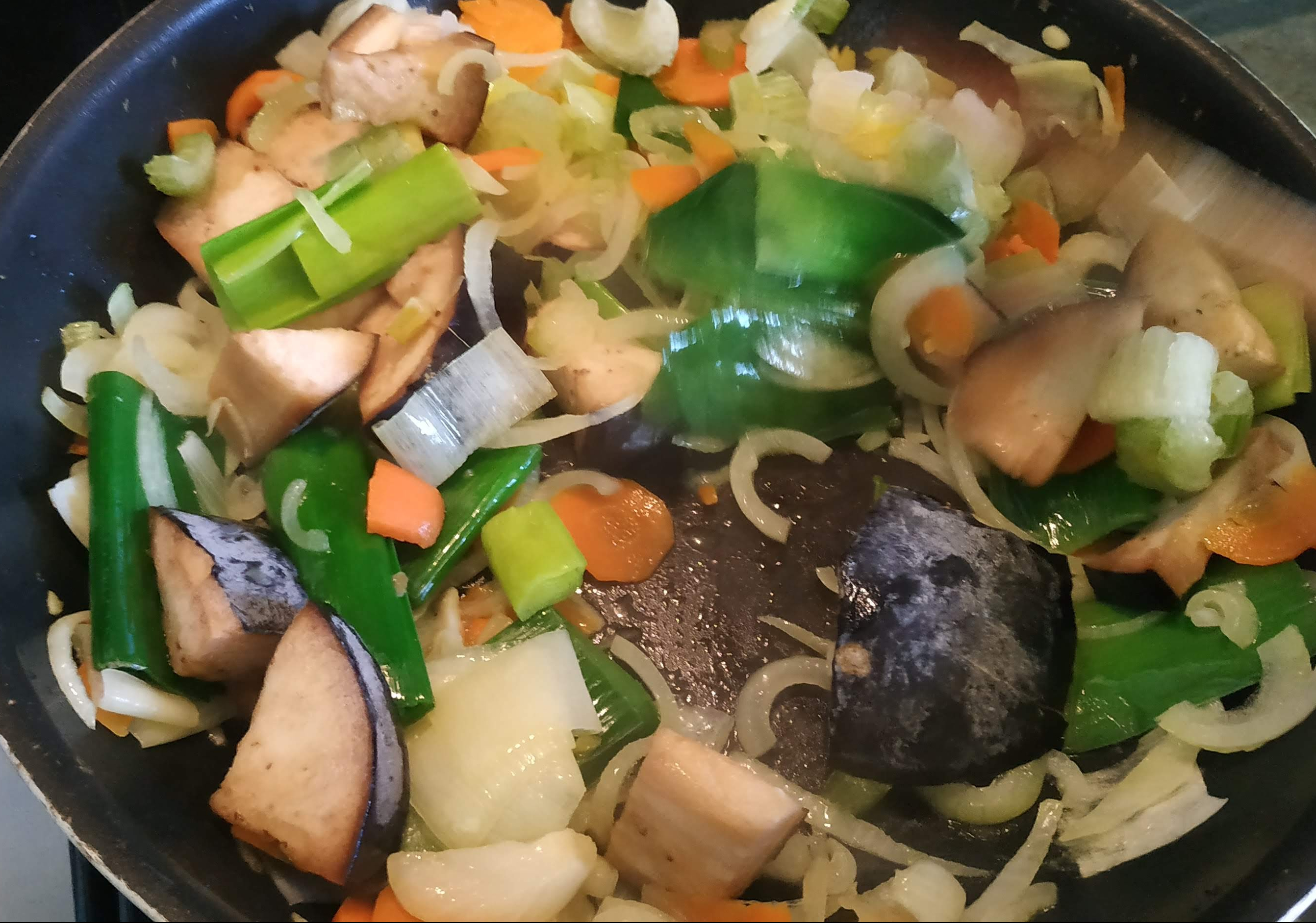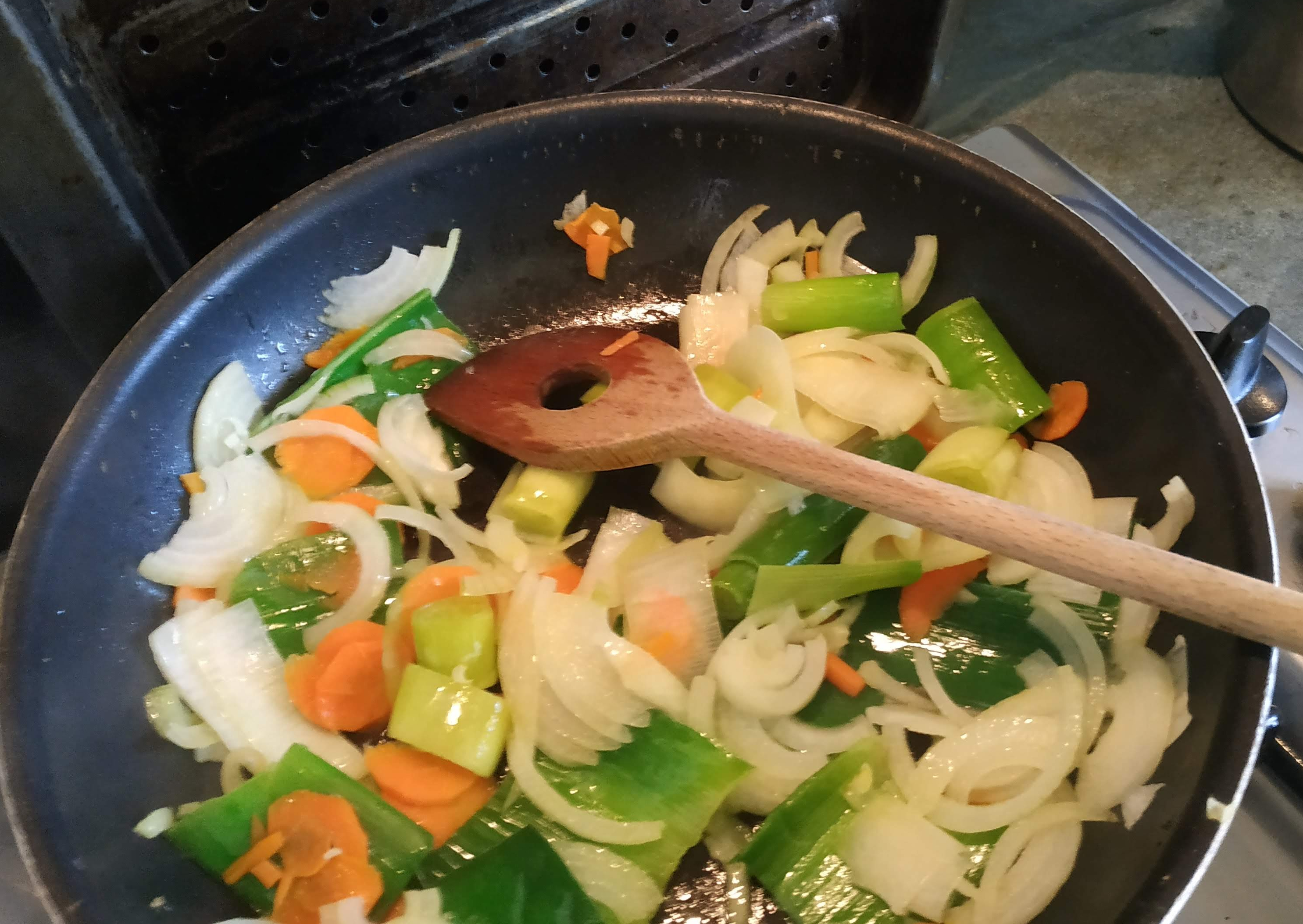 3-Dans une poêle chaude, faire revenir avec l’huile les légumes coupés :carotte, poireau, aubergine, ognon, cèleri quelques 5 minutes environ, en remuant de temps en temps.