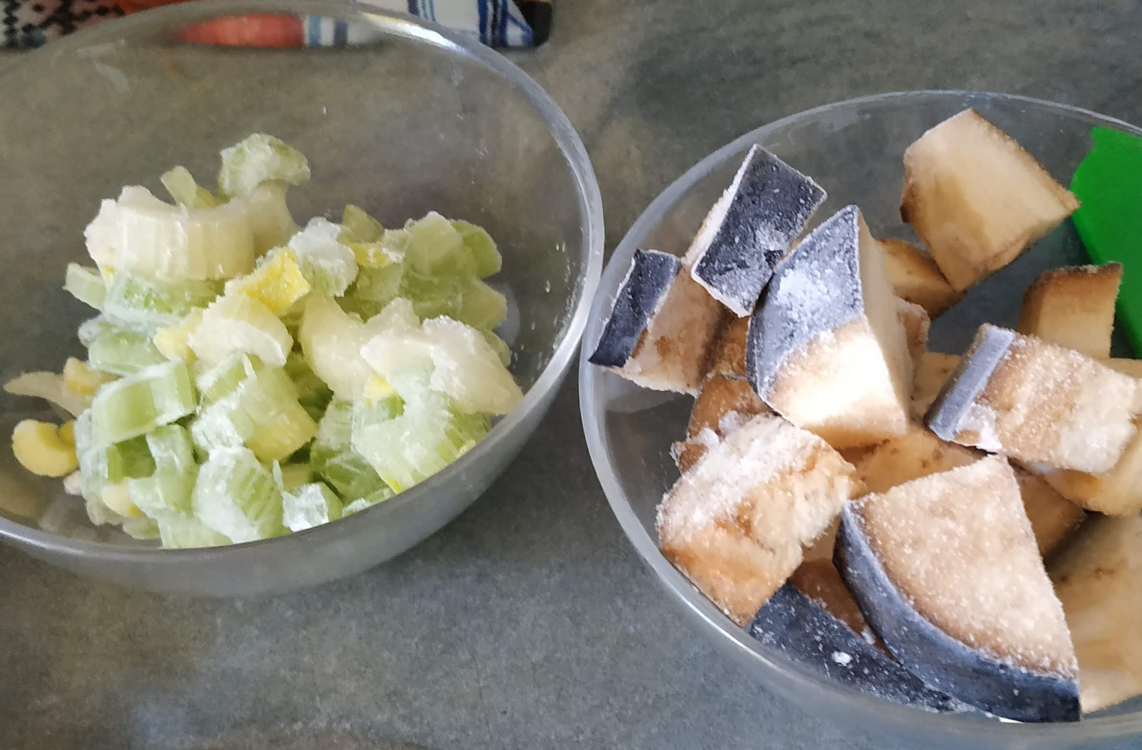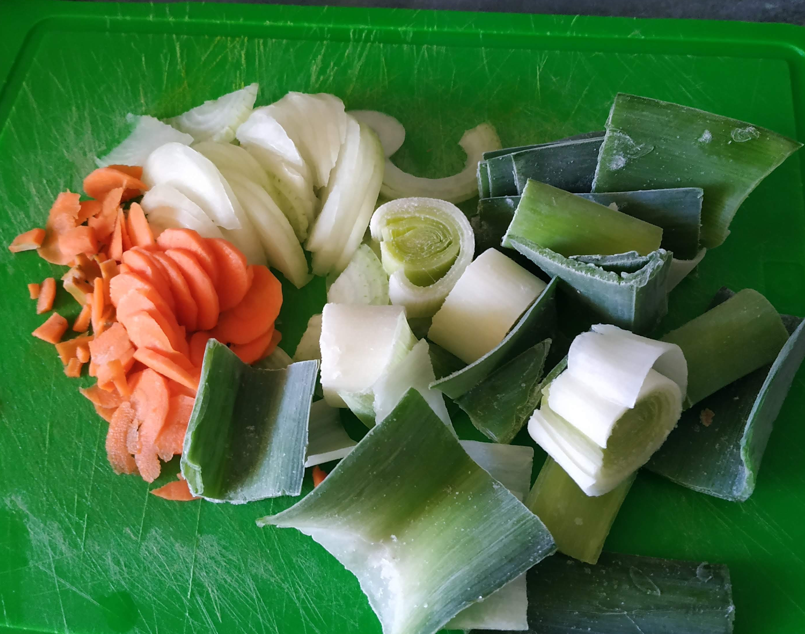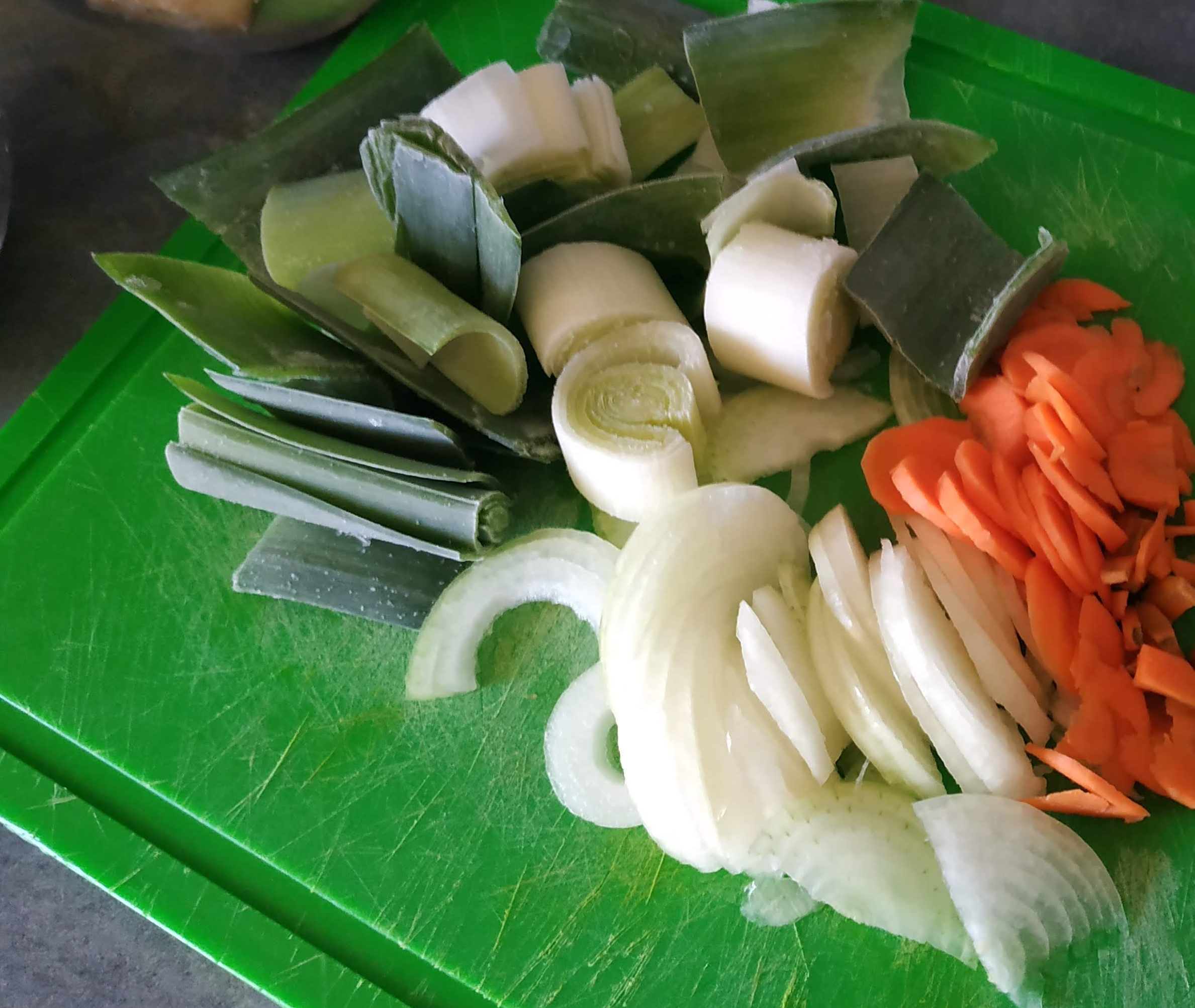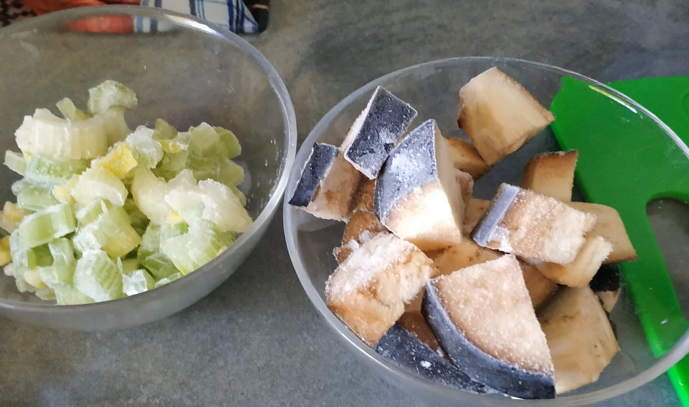 3-Dans une poêle chaude, faire revenir avec l’huile les légumes coupés :carotte, poireau, aubergine, ognon, cèleri quelques 5 minutes environ, en remuant de temps en temps.