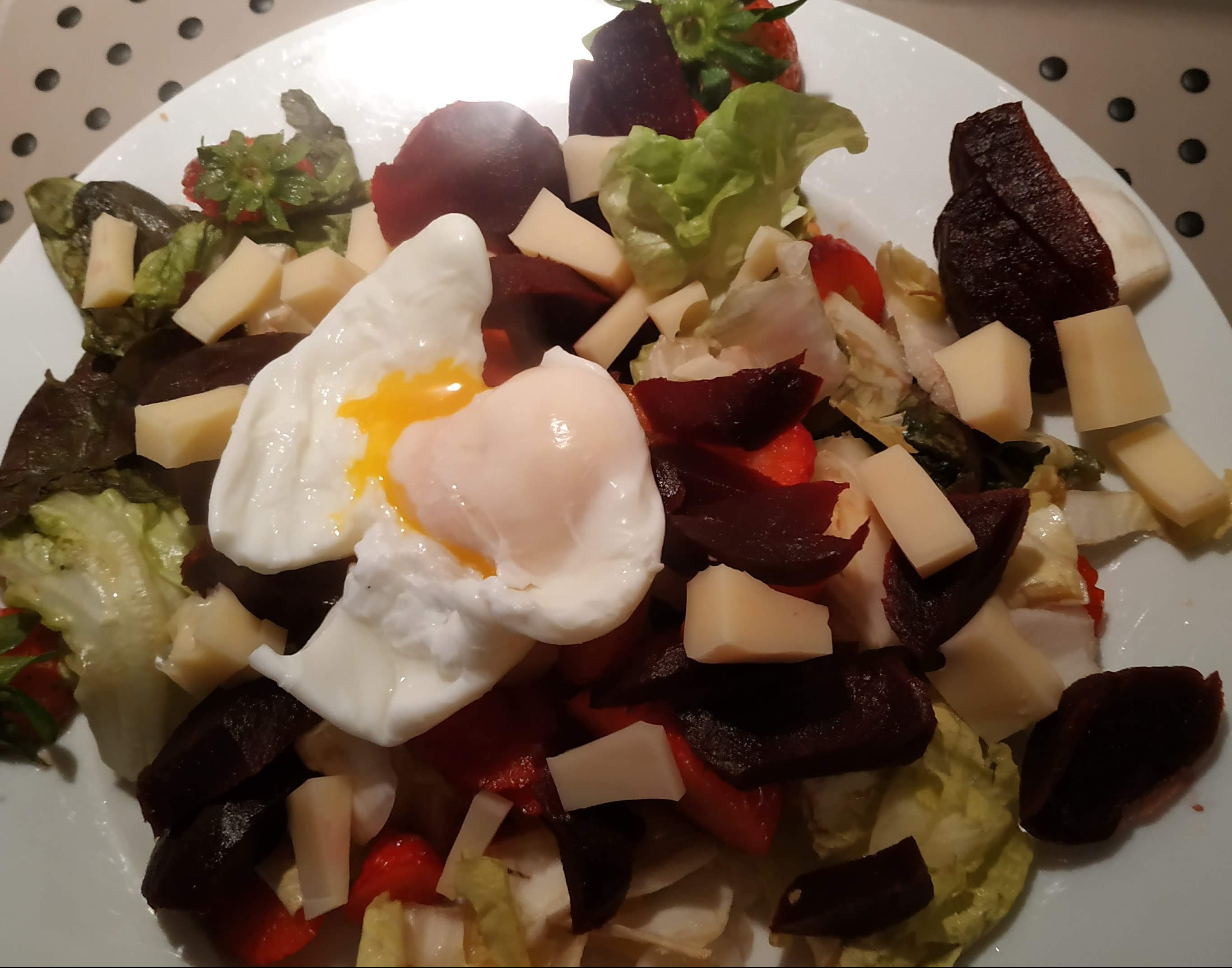 - Mélanger les ingrédients et déposer l’œuf poché au dessus de l’assiette