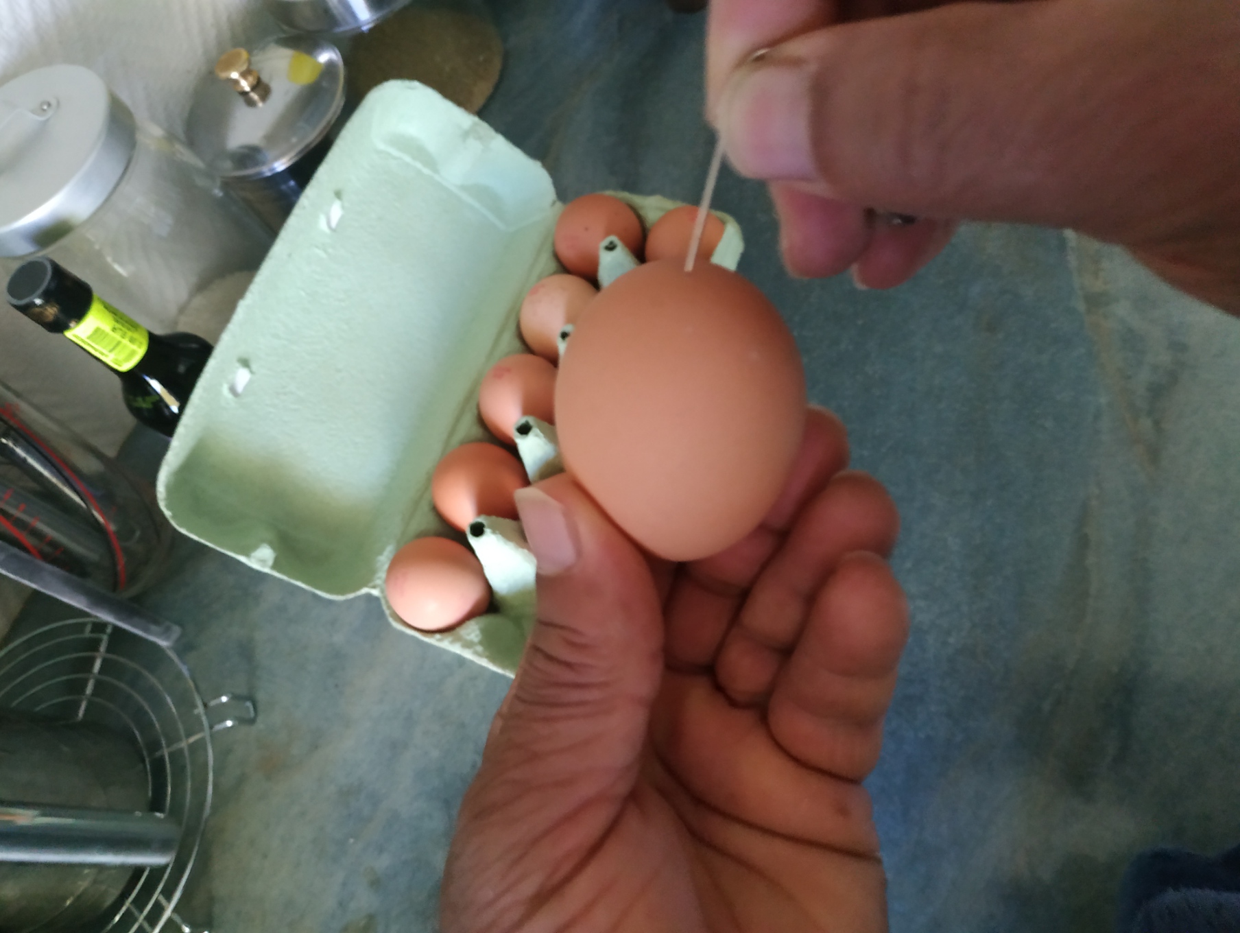étape n°3 : piquez la partie ronde de l’œuf avec la pointe de l’épingle pour faire sortir l’air la poche d’ai qui s’y trouve;