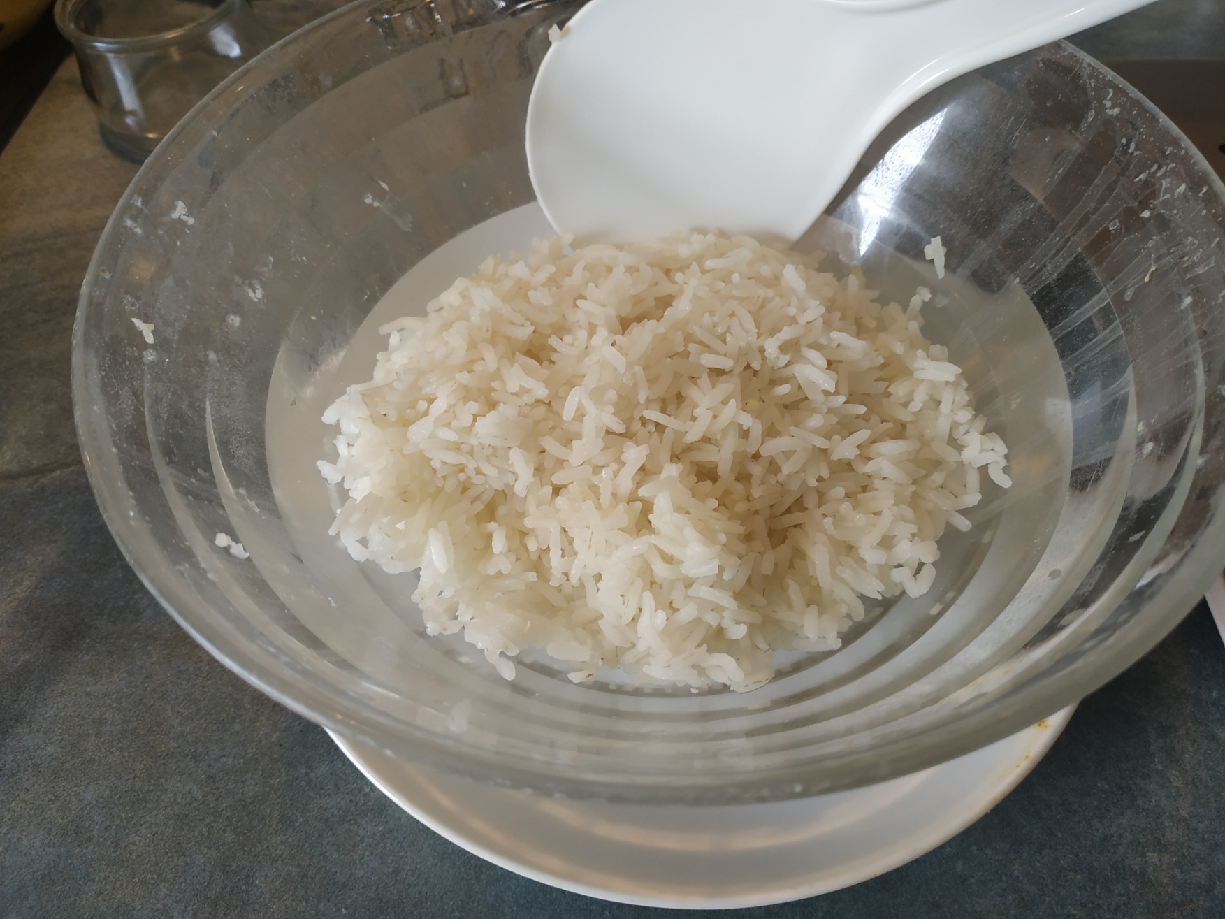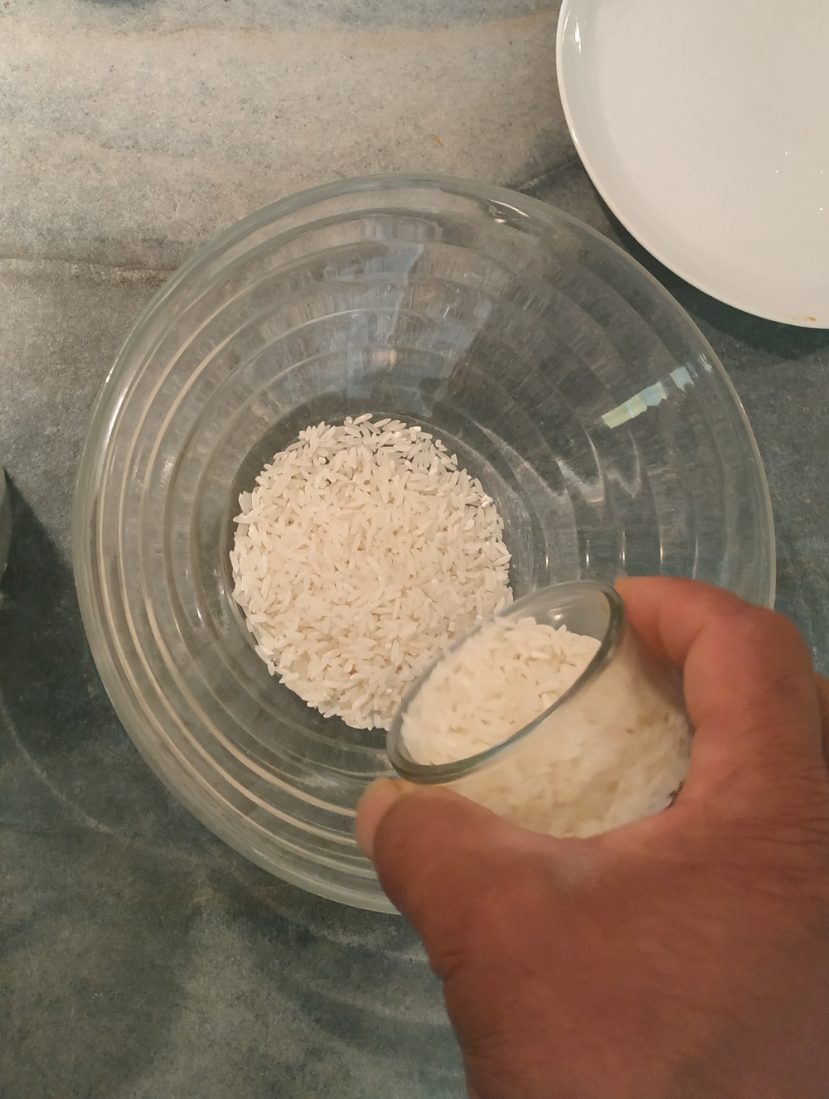 lavez votre riz à l’eau froide , puis recouvrir le riz d’eau froide sans excéder la contenance du saladier