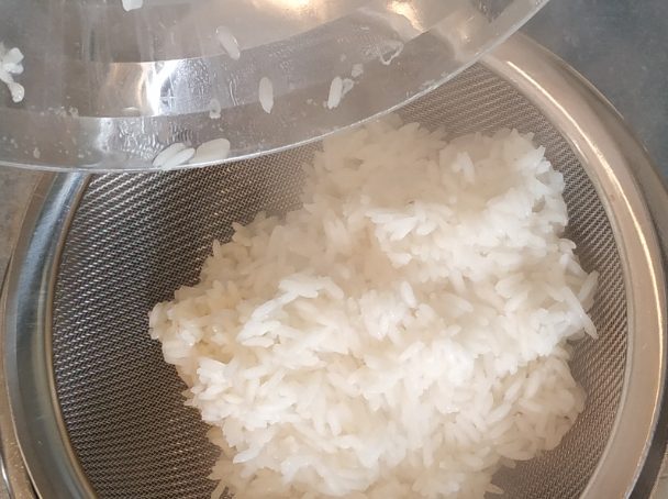 – Au bout de 10 minutes, retirez le saladier du four, et le filtrer à l’aide d’une passoire afin d’enlever le surplus d’eau, et remettre le riz dans le saladier . Continuez la cuisson dans le four pendant 5 minutes supplémentaires pour parfaire la cuisson;